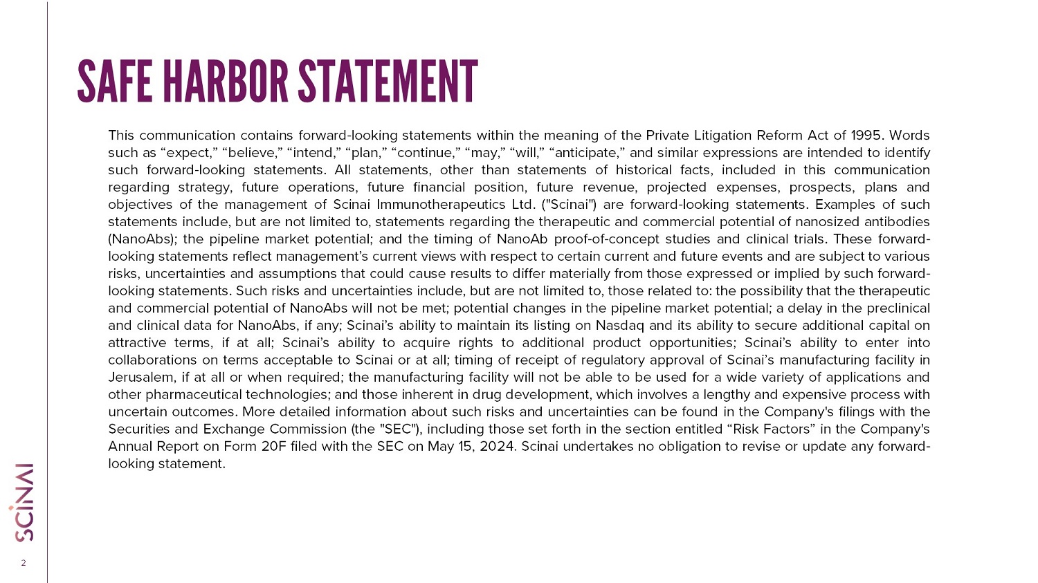 点击编辑Master Title STYLE 2安全港声明本通讯包含1995年《私人诉讼改革法案》含义内的前瞻性声明。“预期”、“相信”、“打算”、“计划”、“继续”、“可能”、“将”、“预期”等词语以及类似表述旨在识别此类前瞻性陈述。除历史事实陈述外,本通讯中包含的有关Scinai Immunotherapeutics Ltd.(“Scinai”)管理层的战略、未来运营、未来财务状况、未来收入、预计费用、前景、计划和目标的所有陈述均为前瞻性陈述。此类声明的例子包括但不限于有关纳米抗体(NanoAB)的治疗和商业潜力的声明;管道市场潜力;以及NanoAB概念验证研究和临床试验的时间安排。这些前瞻性陈述反映了管理层目前对某些当前和未来事件的看法,并受到各种风险、不确定性和假设的影响,这些风险、不确定性和假设可能导致结果与此类前瞻性陈述明示或暗示的结果存在重大差异。此类风险和不确定性包括但不限于与以下相关的风险和不确定性:NanoAB的治疗和商业潜力可能无法满足;管道市场潜力的潜在变化;NanoAB的临床前和临床数据延迟,如果有的话;Scinai维持其在纳斯达克上市的能力以及以有吸引力的条款获得额外资本的能力,如果有的话;Scinai获得额外产品机会权利的能力;Scinai以Scinai可接受的条款或根本无法达成合作的能力;Scinai在耶路撒冷的制造设施收到监管批准的时间,如果有的话或在需要时;该制造设施将无法用于广泛的各种应用和其他制药技术;以及药物开发中固有的那些,这涉及一个漫长而昂贵的过程,结果不确定。有关此类风险和不确定性的更详细信息,请参见公司向美国证券交易委员会(“SEC”)提交的文件,包括公司于2024年5月15日向SEC提交的20F表格年度报告中题为“风险因素”一节中所述的信息。Scinai不承担修改或更新任何前瞻性陈述的义务。