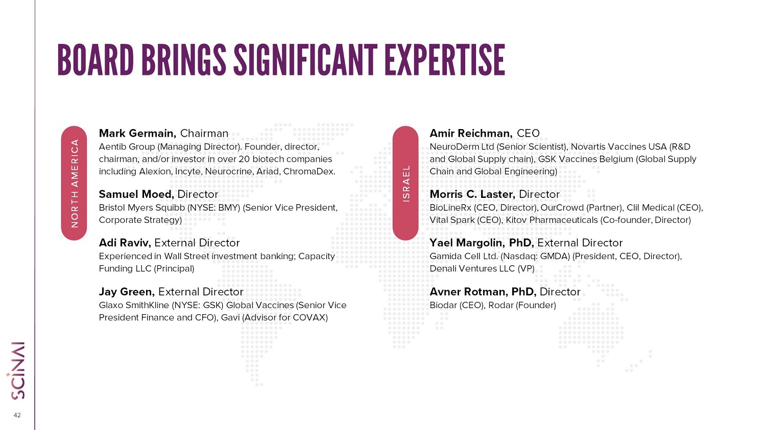 点击编辑Master Title STYLE 42 Mark Germain,Aentib集团董事长(董事总经理)。Alexion、因塞特医疗、Neurocrine、Ariad、ChromaDex等超20家生物科技公司的创始人、董事、董事长和/或投资人。Amir Reichman,CEO NeuroDerm Ltd(高级科学家),Novartis Vaccines USA(研发和全球供应链),GSK Vaccines Belgium(全球供应链和全球工程)Adi Raviv,外部董事,经验丰富的华尔街投资银行;Capacity Funding LLC(Principal)TERM0,董事Bristol Myers Squibb(NYSE:BMY)(公司战略高级副总裁)Morris C. Laster,董事BioLineRx(CEO、董事),OurCrowd(合伙人),Clil Medical(CEO),Vital Spark(CEO),Kitov Pharmaceuticals(Co. founder,director)Jay Green,外部董事Glaxo SmithKline(NYSE:GSK)Global Vaccines(高级副外部董事Gamida Cell Ltd.(纳斯达克:GMDA)(总裁、首席执行官、董事)、Denali Ventures LLC(副总裁)Avner Rotman,博士,Biodar董事(首席执行官),Rodar(创始人)北美以色列董事会带来重要专业知识