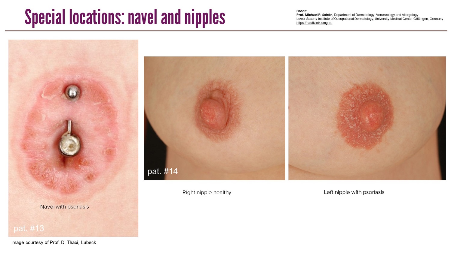 点击编辑大师标题风格特殊位置:肚脐和乳头图片由D. Thaci教授提供,L ü beck pat。# 13拍。# 14右乳头健康左乳头伴银屑病脐部伴银屑病图片来源:Michael P. Sch ö n教授,德国哥廷根大学医学中心下萨克森州职业皮肤病研究所皮肤科https://hautklinik.umg.eu