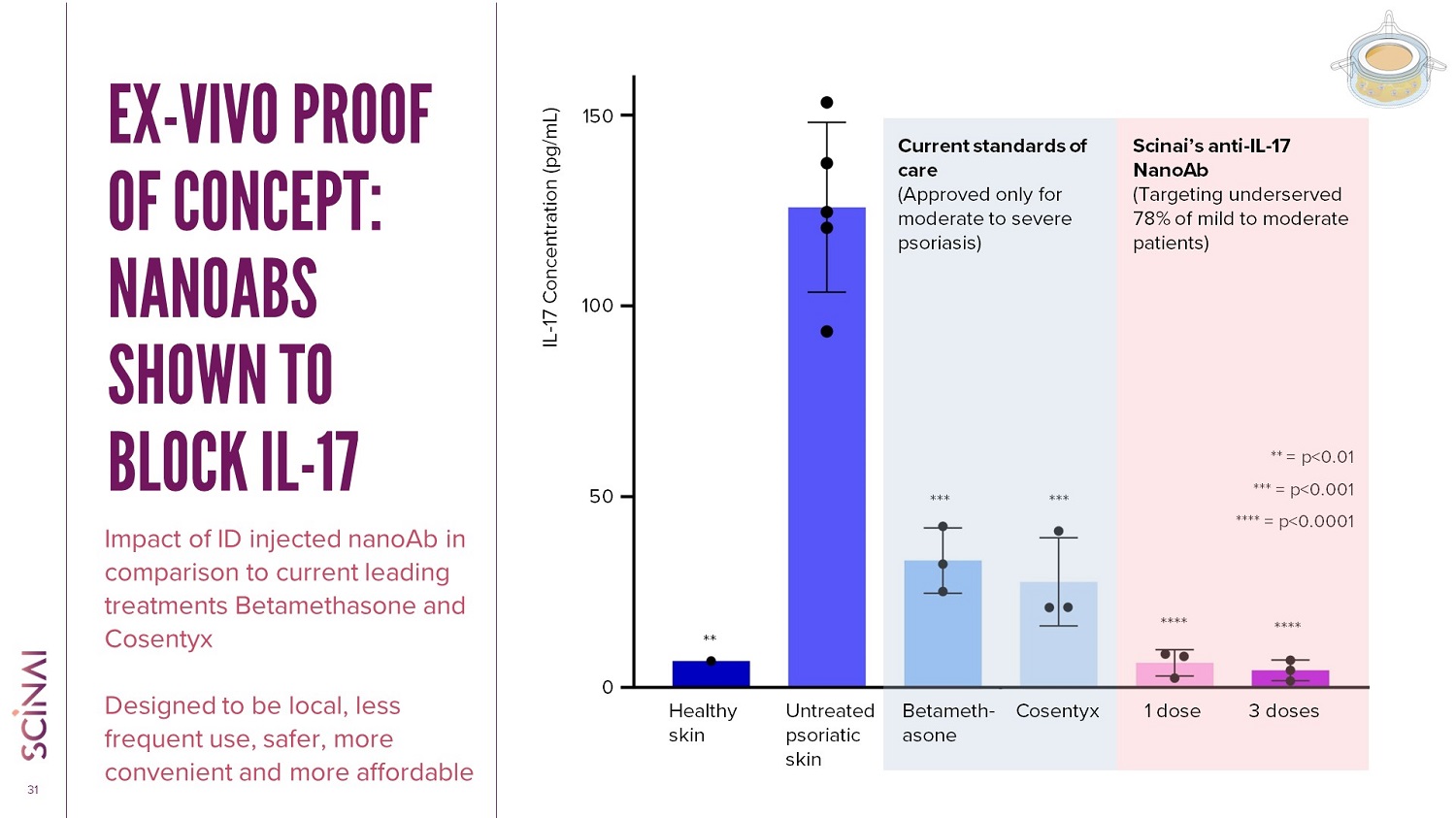 点击编辑Master Title STYLE 31 EX-VIVO概念验证:NANOABS显示可阻止IL-17与目前领先的治疗方法倍他米松和Cosentyx相比,ID注射的nanoAB的影响被设计为局部的、较少使用的、更安全的,更方便、更实惠* * * = p < 0.001 * * * * = p < 0.0001 * * * = p < 0.01 * ************健康皮肤Betameth-asone Cosentyx Scinai的抗-IL-17 nanoAB(针对78%的轻中度患者服务不足)IL-17浓度(pg/ml)未经治疗的银屑病皮肤当前护理标准(仅批准用于中度至重度银屑病)1剂3剂* * 050100150