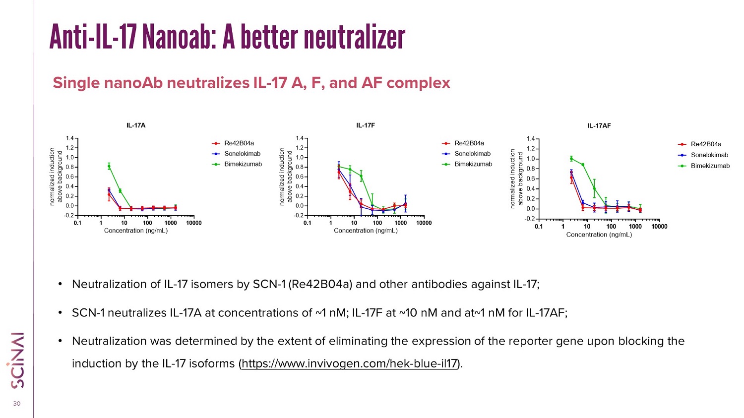 点击编辑大师TITLE STYLE 30 Anti-IL-17 Nanoab:更好的中和剂单一nanoAB可中和IL-17 A、F、和AF复合体0.11 10100100010000-0.2 0.0 0.2 0.4 0.6 0.8 1.0 1.2 1.4 IL-17A浓度(ng/ml)n o r m a l i z e d i n d u c t i o n a b o v e b a c k g r o u n d re42b04a Sonelokimab bimekizumab 0.11 10100100010000-0.2 0.0 0.2 0.4 0.6 0.8 1.0 1.2 1.4 IL-17F浓度(ng/ml)n o r m a l i z e d i n d u c t i o n a b o v eb a c k g r o u n d re42b04a Sonelokimab Bimekizumab • SCN-1(re42B04a)和其他抗IL-17抗体对IL-17异构体的中和作用;• SCN-1在~1 nm的浓度下中和IL-17A;IL-17F在~10 nm和~1 nm的IL-17AF;•中和作用通过IL-17异构体阻断诱导时消除报告基因表达的程度来确定(https://www.invivogen.com/hek-blue-il17)。