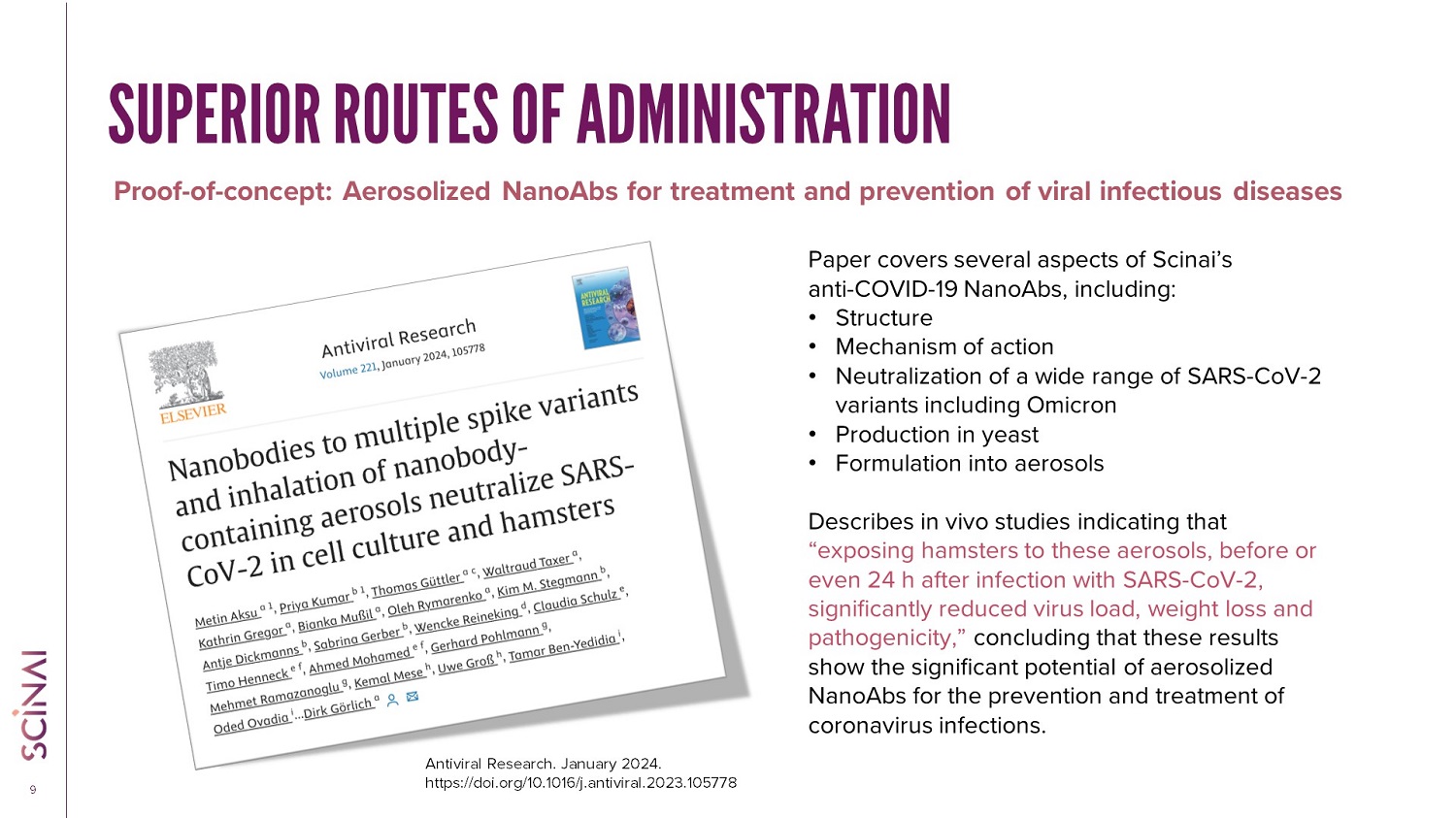 点击编辑Master Title Style9 Superior RUUTES of Administration P aper涵盖Scinai抗COVID-19纳米抗体的几个方面,包括:• S结构•作用机制•中和范围广泛的SARS-CoV-2变体,包括Omicron •在酵母中生产•配制成气溶胶描述了体内研究表明,“在感染SARS-CoV-2之前甚至24小时后,将仓鼠暴露于这些气溶胶中,可显着降低病毒载量、体重减轻和致病性,”结论认为,这些结果显示了雾化纳米抗体在预防和治疗冠状病毒感染方面的巨大潜力。Proof-of-concept:用于治疗和预防病毒性传染病的雾化纳米抗体抗病毒研究。2024年1月。https://doi.org/10.1016/j.antiviral.2023.105778