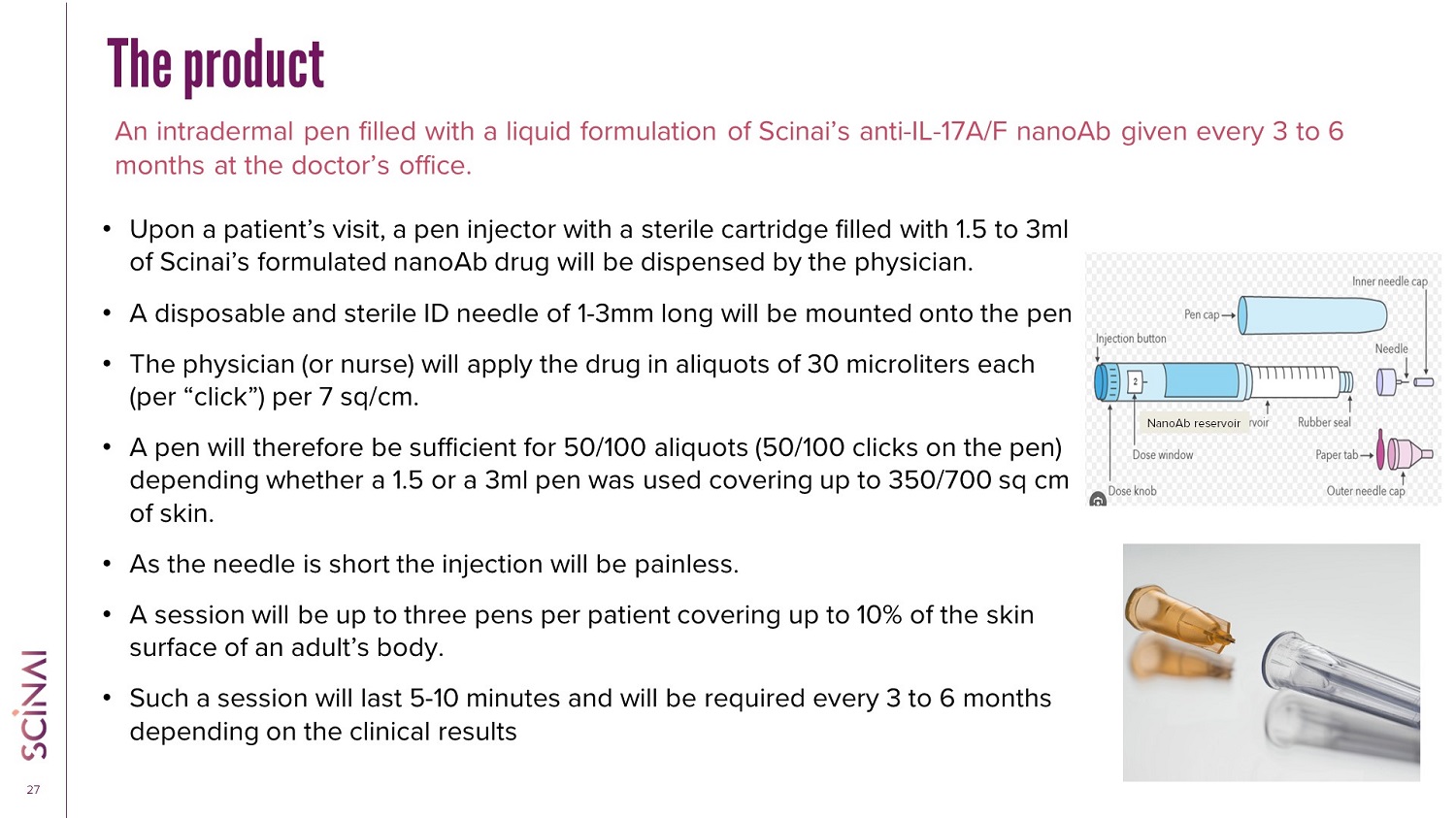 点击编辑Master Title STYLE 27产品一种皮内笔,里面装满了Scinai抗IL-17A/F nanoAB的液体配方,每3到6个月在医生办公室给药一次。•在患者就诊时,医生将配发一个带有无菌药筒的钢笔注射器,里面装满1.5至3ml的Scinai配制的nanoAB药物。•笔上将安装1-3mm长的一次性和无菌ID针•医师(或护士)将以每7平方厘米(每次“点击”)30微升的等分试样涂抹药物。•因此,一支笔足够50/100等分试样(50/100次点击笔),这取决于使用的是1.5或3ml笔,覆盖多达350/700平方厘米的皮肤。•由于针头短,注射就会无痛。•一个疗程将是每位患者最多三支笔,覆盖成人身体皮肤表面的10%。•这样的疗程将持续5-10分钟,根据临床结果,每3至6个月需要一次NANOAB储存库