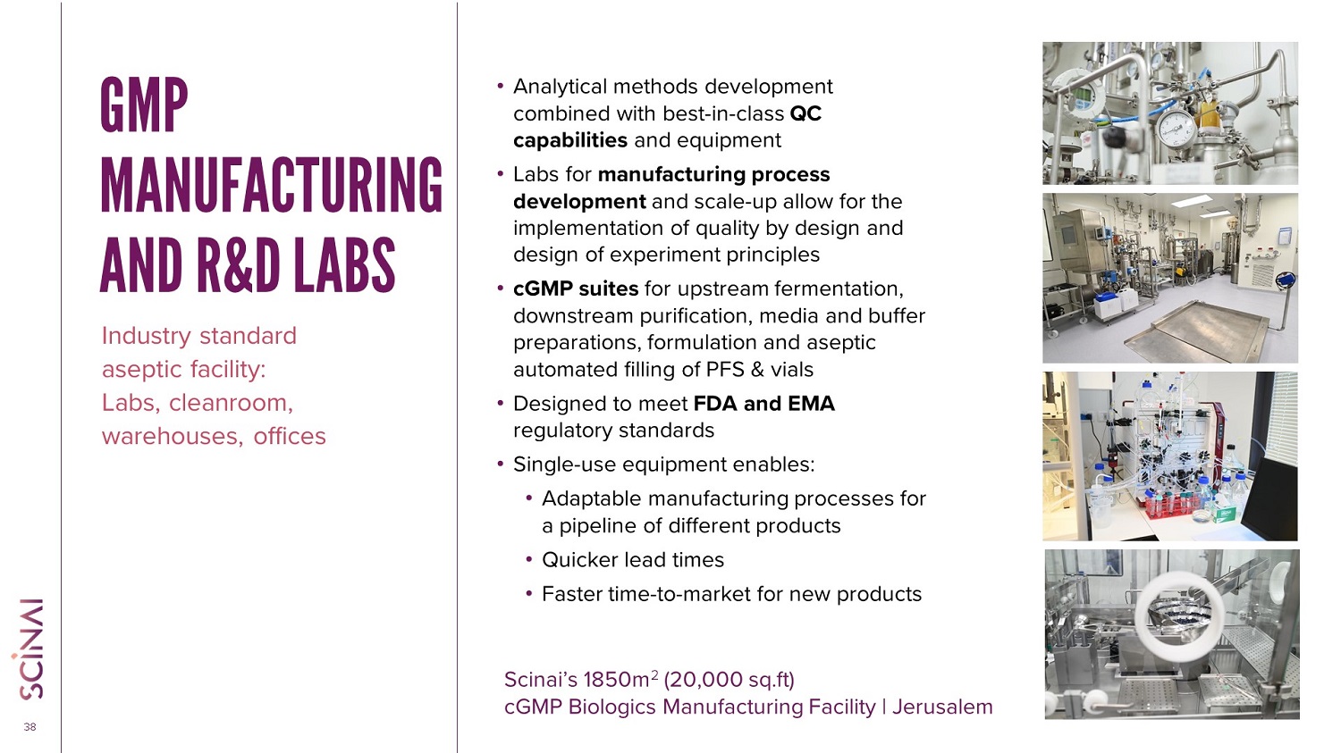 点击编辑Master Title STYLE 38 GMP制造和研发实验室行业标准无菌设施:实验室、洁净室、仓库、办公室•分析方法开发与一流的QC能力和设备相结合•制造工艺开发和扩大规模的实验室允许通过设计和设计实验原则来实现质量•用于上游发酵、下游纯化、培养基和缓冲制剂的cGMP套件,PFS &小瓶的配方和无菌自动化灌装•旨在满足FDA和EMA监管标准•一次性使用设备能够:•适用于不同产品管道的适应性制造工艺•更快的交货时间•新产品更快的上市时间Scinai的1850m 2(20,000 sq.ft)cGMP生物制剂制造设施|耶路撒冷