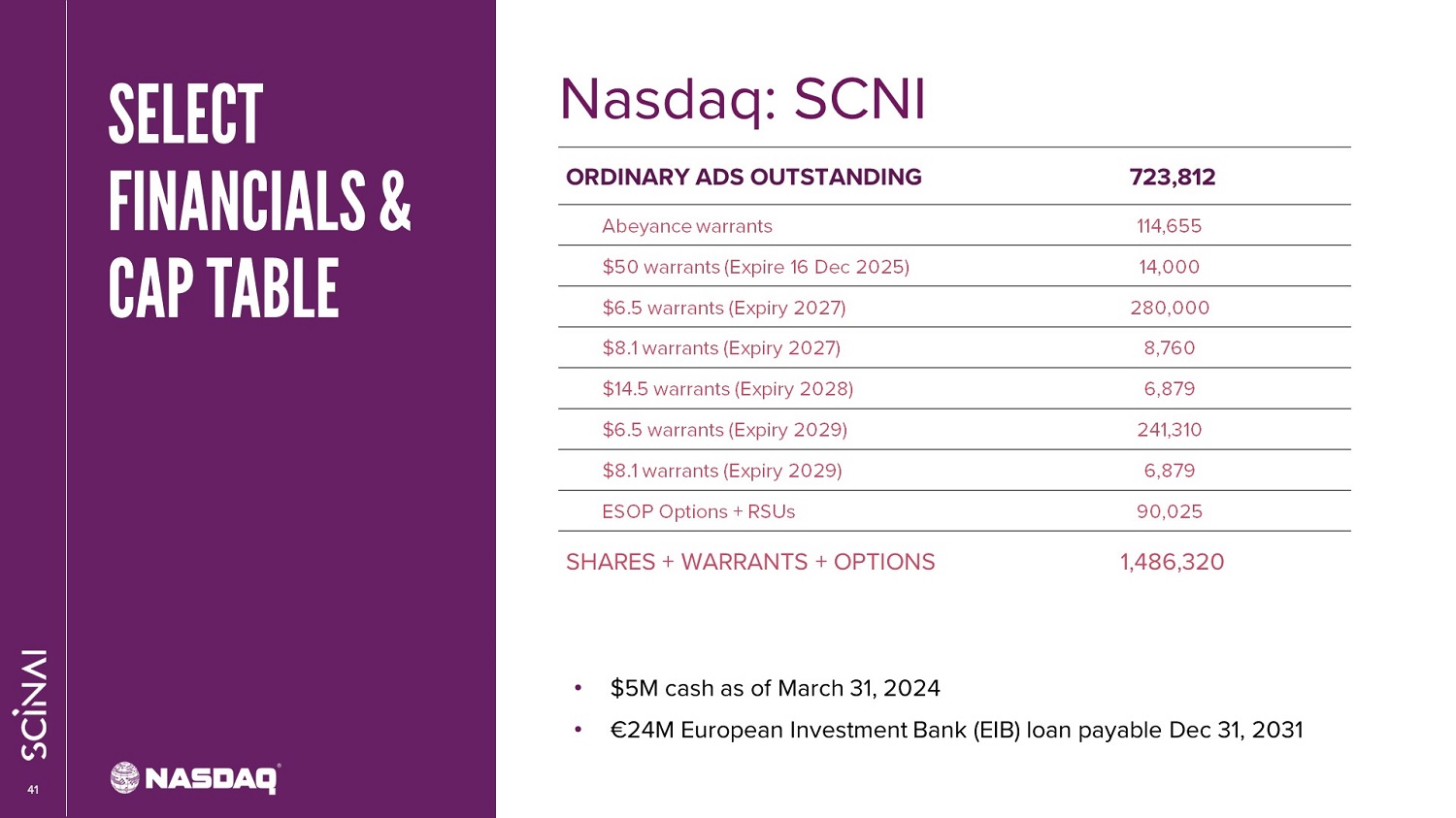 点击编辑Master Title Style 41 Select Financials & CAP Table •截至2024年3月31日的500万美元现金• 2031年12月31日应付的2400万欧元欧洲投资银行(EIB)贷款纳斯达克:SCNI 723,812未偿还的普通ADS 114,655 Abeyance认股权证14,000美元50美元认股权证(2025年12月16日到期)280,000美元6.5美元认股权证(2027年到期)8,760美元8.1美元认股权证(2027年到期)6,879美元14.5美元认股权证(2028年到期)2,41,310美元6.5美元认股权证(2029年到期)6,879美元8.1美元认股权证(2029年到期)90,025股ESOP期权+受限制股份单位1,486,320股+认股权证