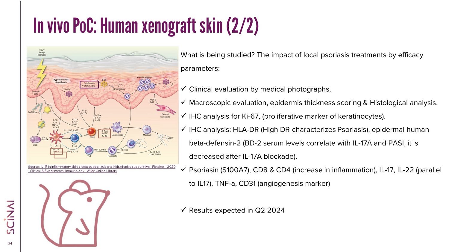 点击编辑大师TITLE STYLE 34 In vivo POC:人类异种移植皮肤(2/2)正在研究什么?疗效参数对局部银屑病治疗的影响:x医学照片临床评价。x宏观评价、表皮厚度评分&组织学分析。x Ki-67的IHC分析,(角质形成细胞的增殖标志物)。x TERM0分析:HLA-DR(高DR表征银屑病),表皮人β-防御素-2(BD-2血清水平与IL-17A和PASI相关,IL-17A阻断后降低)。x银屑病酶(S100A7),CD8 & CD4(炎症增加),IL-17,IL-22(平行于IL17),TNF-a,CD31(血管生成标志物)x 2024年第二季度预期结果来源:IL-17在炎症性皮肤病银屑病和化脓性汗腺炎-Fletcher-2020-临床和实验免疫学-Wiley在线图书馆