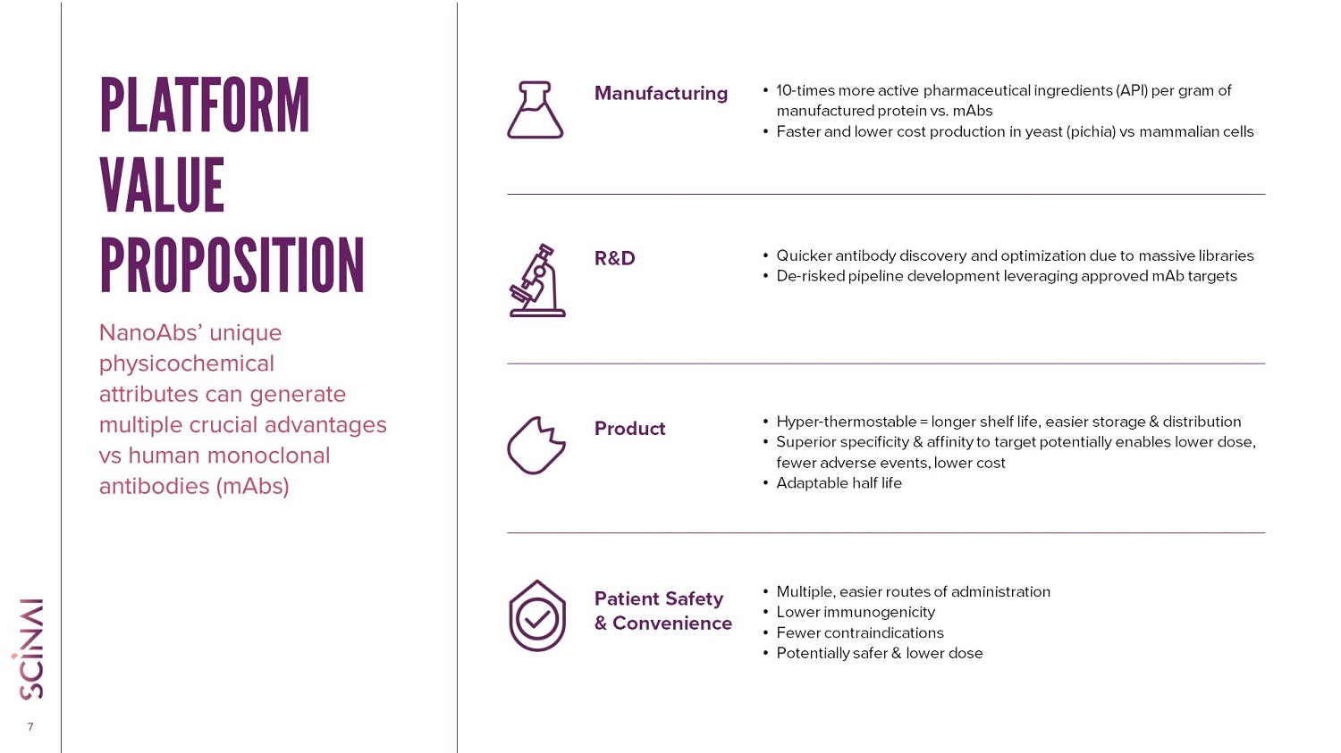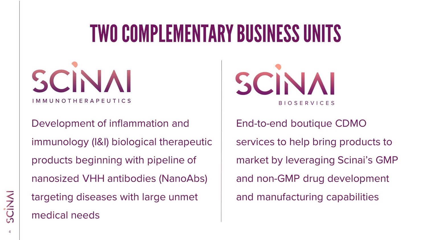 点击编辑Master Title STYLE4两个互补业务单元端到端精品CDMO服务,通过利用Scinai的GMP和非GMP药物开发和制造能力,帮助将产品推向市场开发炎症和免疫学(I & I)生物治疗产品,从靶向有大量未满足医疗需求的疾病的纳米VHH抗体(nanoAB)管线开始