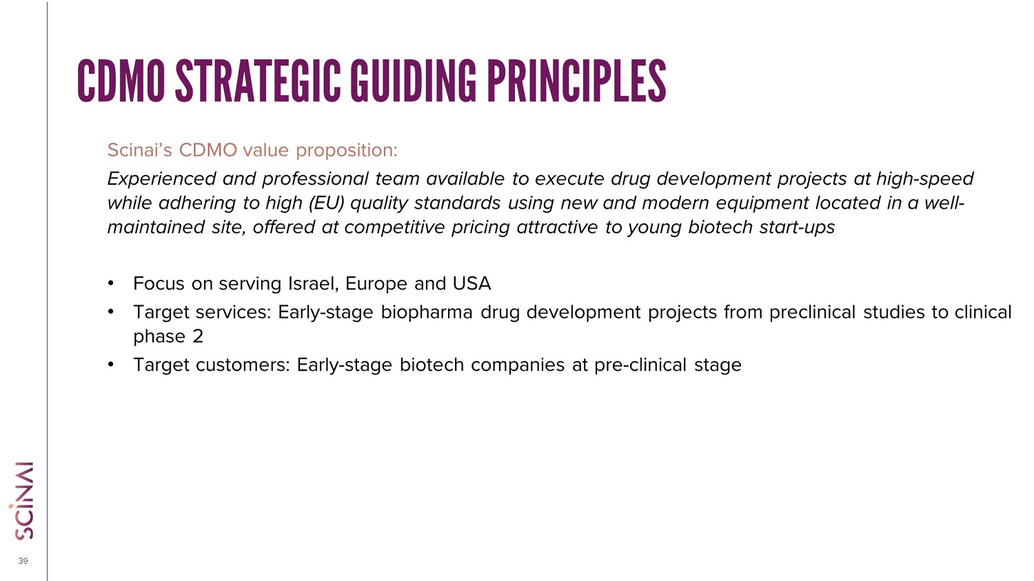 点击编辑Master Title STYLE 39 CDMO战略指导原则Scinai的CDMO价值主张:经验丰富且专业的团队可用来高速执行药物开发项目,同时使用位于维护良好的场地内的新型现代设备遵守高(欧盟)质量标准,以对年轻的生物技术初创企业具有吸引力的有竞争力的价格提供•专注于服务以色列、欧洲和美国•目标服务:从临床前研究到临床2期的早期生物制药药物开发项目•目标客户:处于临床前阶段的早期生物技术公司