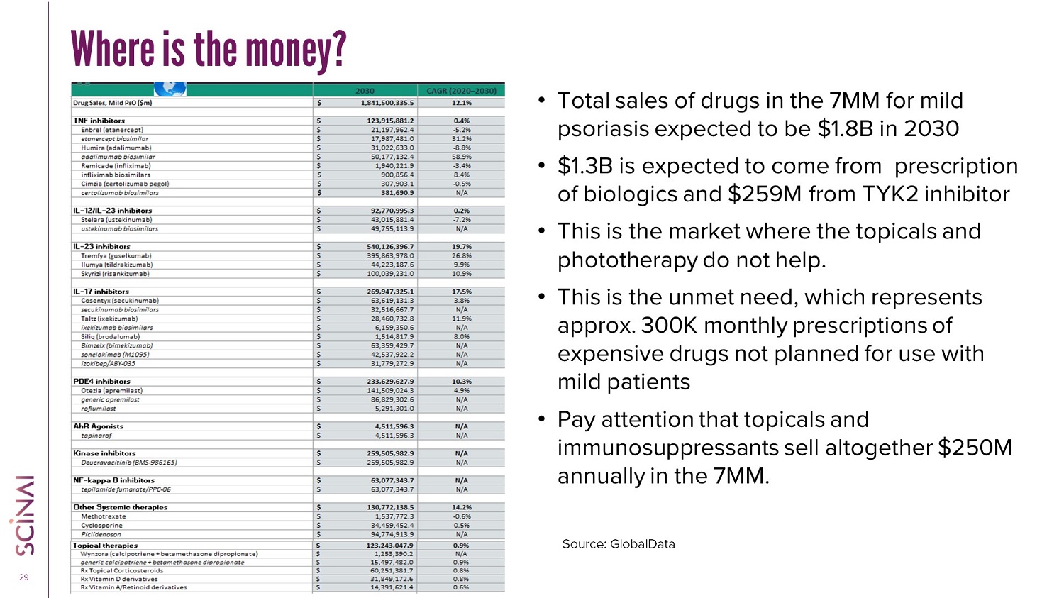 点击编辑硕士职称style 29钱在哪里?•预计2030年用于轻度银屑病的7mm药物总销售额为$ 1.8B •预计$ 1.3B将来自生物制剂处方,2.59亿美元来自TYK2抑制剂•这是外用药物和光疗没有帮助的市场。•这是未被满足的需求,这代表着每月约30万张不计划用于轻症患者的昂贵药物处方•注意,外用药物和免疫抑制剂在7mm的年销售额总计2.5亿美元。资料来源:GlobalData