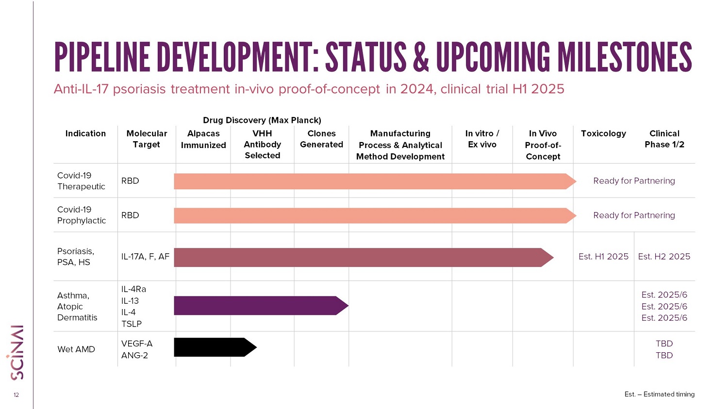 点击编辑Master Title STYLE 12 PIPELINE Development:Status & UpComing MILESTNES Anti-IL-17银屑病治疗2024年体内验证-概念,临床试验H1 2025临床1/2期毒理学体内验证-概念体外/体外制造工艺&分析方法开发克隆生成VHH抗体选定羊驼免疫分子靶点适应症准备好与RBD新冠合作-19治疗准备好与RBD新冠合作-19预防性EST。美国东部时间2025年下半年。H1 2025 IL-17a,F,AF银屑病,PSA,HS EST. 2025/6 EST. 2025/6 IL-4ra IL-13 IL-4 TSLP哮喘,特应性皮炎待定待定VEGF-A ANG-2湿AMD药物发现(Max Planck)EST. –估计时间