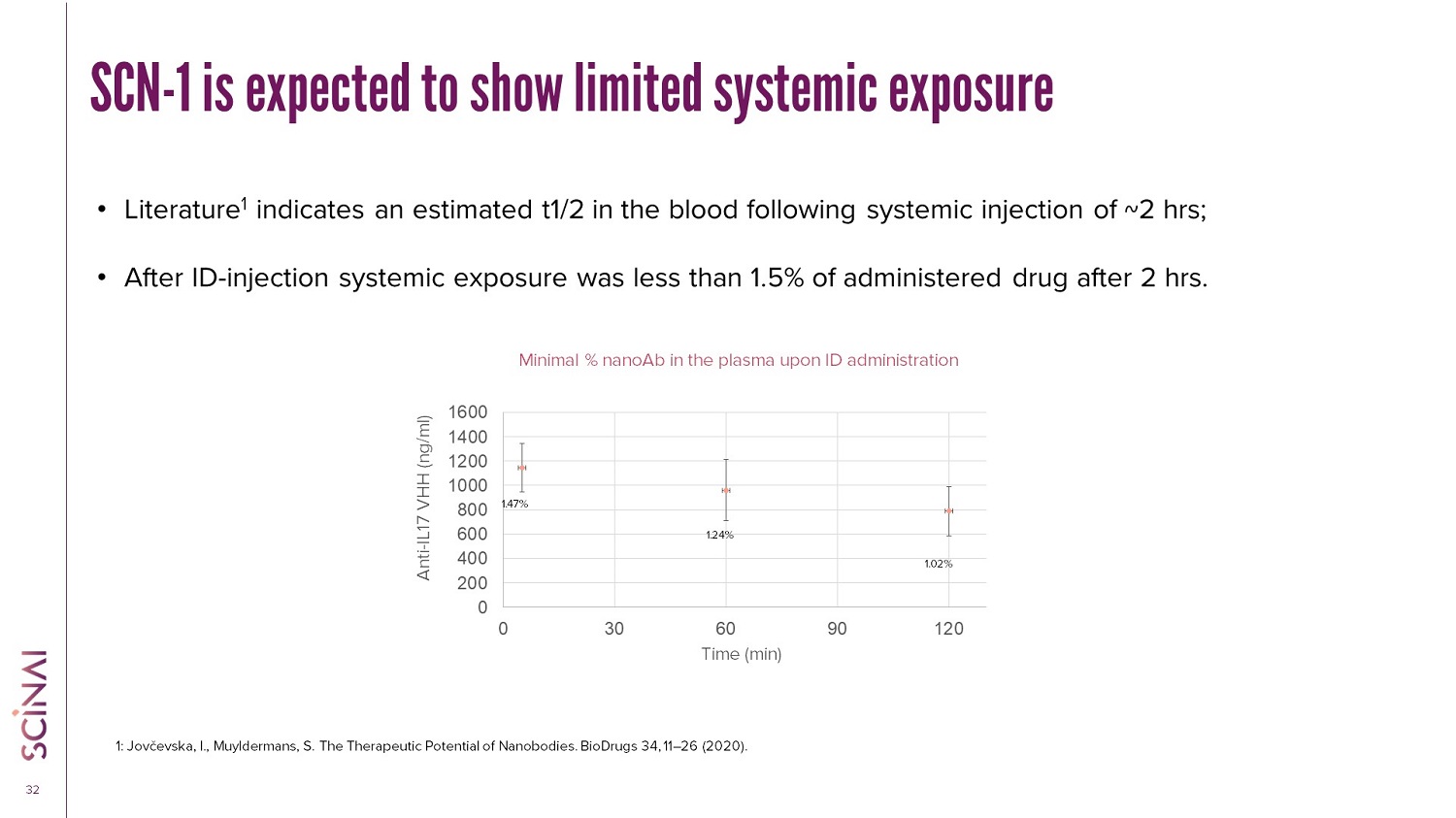 点击编辑主标题样式32 SCN-1预计显示有限的全身暴露•文献1表明全身注射约2小时后血液中估计有t1/2;• ID注射后全身暴露低于2小时后给药药物的1.5%。020040060080010001200140016000306090120抗-IL17 VHH(ng/ml)时间(min)1.47% 1.24% 1.02% ID给药时血浆中最小% nanoAB 1:Jov č evska,I.,Muyldermans,S.纳米抗体的治疗潜力。BioDrugs 34,11 – 26(2020)。