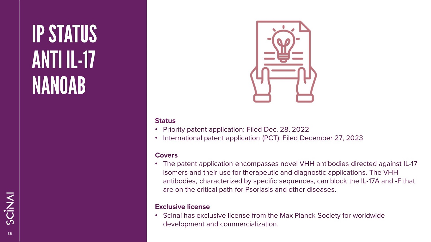 点击编辑Master Title STYLE 36 IP Status ANTI IL-17 NANOAB Status •优先权专利申请:2022年12月28日提交•国际专利申请(PCT):2023年12月27日提交涵盖•专利申请包括针对IL-17异构体的新型VHH抗体及其用于治疗和诊断应用。以特定序列为特征的VHH抗体可阻断处于银屑病和其他疾病关键路径上的IL-17A和-F。独家授权• Scinai获得马克斯·普朗克协会全球开发和商业化的独家授权。