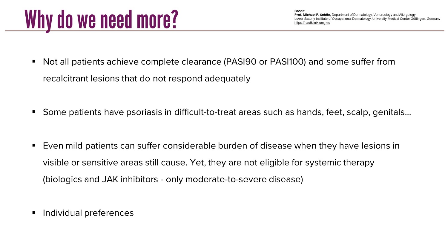 点击编辑硕士职称风格为什么我们需要更多?▪并非所有患者都达到完全清除(PASI90或PASI100),部分患者出现顽固性病变,反应不充分▪部分患者手、脚、头皮、生殖器等难以治疗的部位出现银屑病..。▪即使是轻症患者,在可见或敏感区域仍有病变引起时,也会承受相当大的疾病负担。然而,他们没有资格接受全身性治疗(生物制剂和JAK抑制剂-仅适用于中度至重度疾病)▪个人偏好信用:Michael P. Sch ö n教授,德国哥廷根大学医学中心下萨克森州职业皮肤病研究所皮肤病学、性病学和过敏学系https://hautklinik.umg.eu
