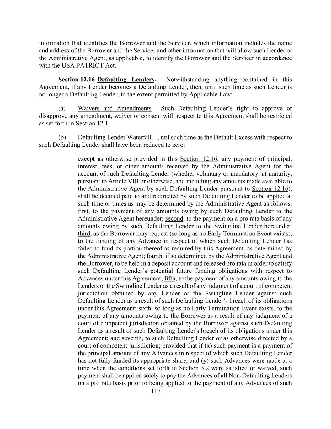 117识别借款人和服务人的信息,其中信息包括借款人和服务人的姓名和地址,以及允许此类贷款人或行政代理人(如适用)根据《美国爱国者法》识别借款人和服务人的其他信息。第12.16节违约放款人。尽管本协议中有任何规定,如果任何贷款人成为违约贷款人,那么,在该贷款人不再是违约贷款人之前,在适用法律允许的范围内:(a)豁免和修正。此类违约贷款人批准或不批准与本协议有关的任何修订、放弃或同意的权利应受到第12.1节规定的限制。(b)违约贷款人瀑布。直至有关该违约贷款人的违约超额已减至零:除本条第12.16款另有规定外,行政代理人为该违约贷款人的账户收到的任何本金、利息、费用或其他款项(不论是自愿或强制性的、到期时、根据第八条或其他方式,包括该违约贷款人根据第12.16款向行政代理人提供的任何款项),应被视为已支付给该违约贷款人并由其重新定向,以在行政代理人可能确定的以下时间或时间申请:第一,支付该违约贷款人根据本协议欠行政代理人的任何款项;第二,按比例支付该违约贷款人根据本协议欠Swingline贷款人的任何款项;第三,根据借款人的要求(只要不存在提前终止事件),为该违约贷款人未能按行政代理人确定的本协议要求为其部分垫款提供资金的任何垫款提供资金;第四,如果行政代理人和借款人如此确定,则应存放在存款账户中并按比例释放,以满足该违约贷款人未来可能就本协议项下的垫款承担的资金义务;第五,就任何贷款人或Swingline贷款人因该违约贷款人违反其在本协议项下的义务而针对该违约贷款人作出的任何有管辖权的法院判决而欠该贷款人或Swingline贷款人的任何款项的支付;第六,只要不存在提前终止事件,支付借款人因该违约贷款人违反其在本协议下的义务而对该违约贷款人作出的任何有管辖权的法院的判决而欠该借款人的任何款项;第七,支付给该违约贷款人或根据有管辖权的法院的其他指示;但如果(x)该等付款是该违约贷款人尚未为其适当份额提供全部资金的任何垫款的本金金额的支付,及(y)该等垫款是在第3.2节所列条件获得满足或豁免时作出的,该等付款须仅用于按比例支付所有非违约贷款人的垫款,然后再用于支付该等垫款的任何垫款