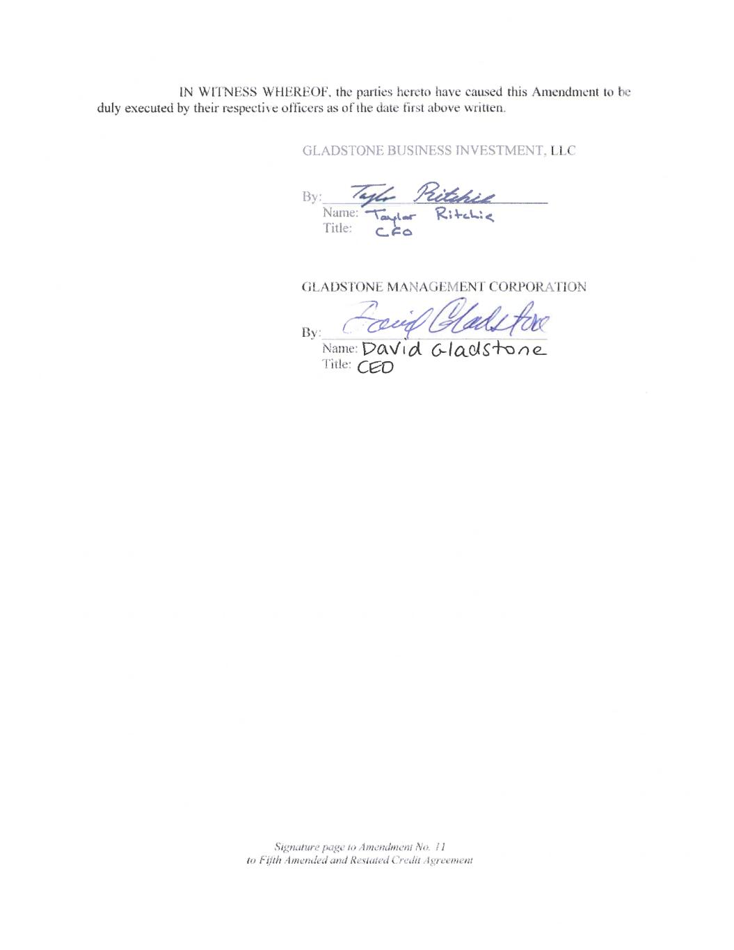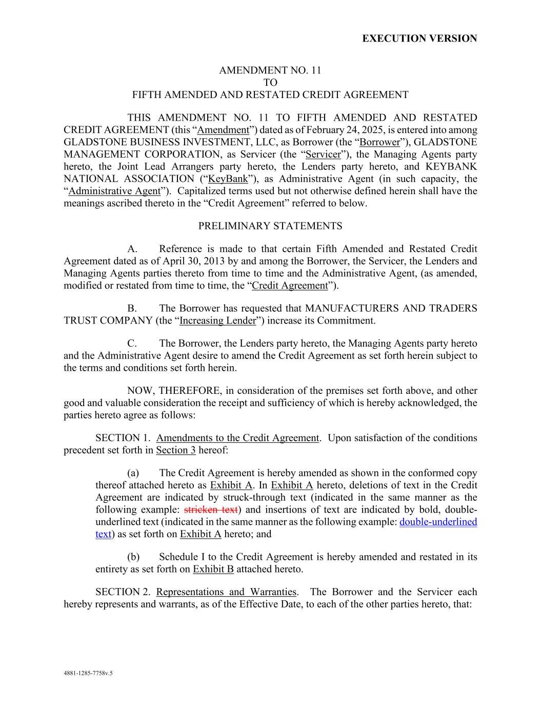执行版本第11至5号修订并重述信贷协议本第11至5号修订并重述信贷协议(本“修订”)日期为2025年2月24日,由Gladstone BusinessInvestment,LLC作为借款人(“借款人”)、Gladstone Management Corporation作为服务商(“服务商”)、管理代理方、联合牵头安排方、贷款方、KEYBANK国家协会之间订立此处使用但未另行定义的大写术语应具有下文提及的“信用协议”中赋予的含义。A.初步声明兹提述借款人、服务人、贷款人及不时与之订立的管理代理方及行政代理人于2013年4月30日订立的若干第五份经修订及重述的信贷协议(经不时修订、修订或重述,“信贷协议”)。B.借款人已要求制造商和贸易商信托公司(“增加贷款人”)增加其承诺。C.借款人、本协议的贷款方、本协议的管理代理方和行政代理人希望根据本协议规定的条款和条件对本协议规定的信贷协议进行修订。现据此,考虑到上述前提条件,以及其他收到并充分性确认的良好、有价值的对价,双方约定如下:第一节。信贷协议的修订。在满足本协议第3节中规定的先决条件后:(a)兹对信用协议进行修订,如所附的一致副本所示,作为附件 A。在本协议的附件 A中,信用协议中的文字删除部分以贯穿文本表示(以与以下示例相同的方式表示:已删除文本),插入的文字则以粗体表示,双下划线文本(以与以下示例相同的方式表示:双下划线文本),载于本协议的附件 A;及(b)信贷协议附表I现予修订及重列,其全文载于本协议所附的附件 B。第2节。申述及保证。借款人和服务商在此各自声明并保证,自生效之日起,本协议的其他各方:4881-1285-7758v.5