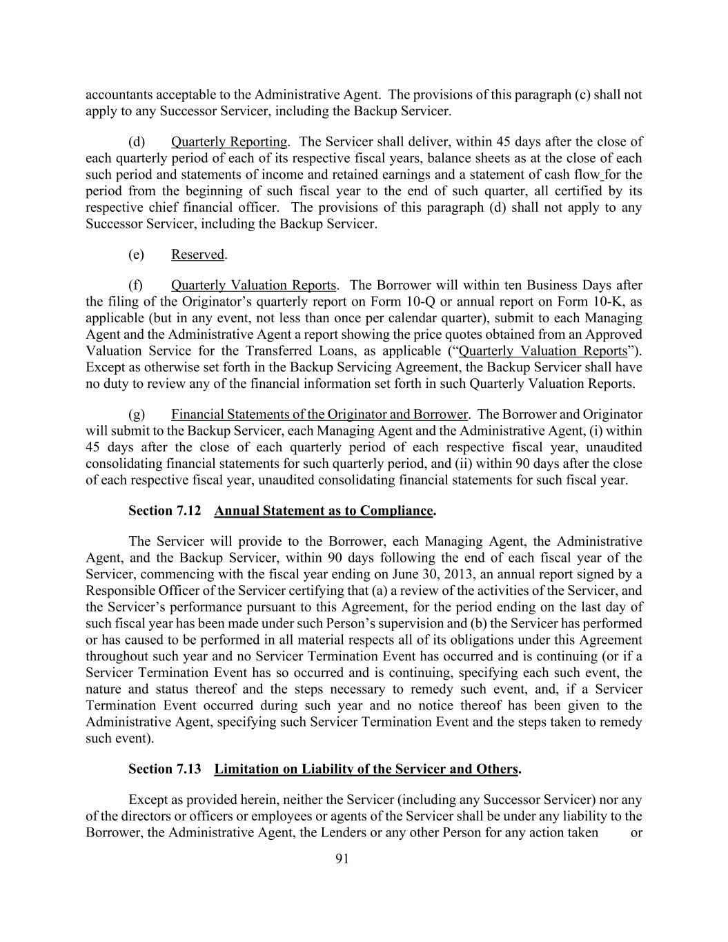行政代理人可接受的会计人员91人。本款(c)项的规定不适用于任何继承服务者,包括备份服务者。(d)季度报告。服务商应在其各自会计年度的每个季度期间结束后的45天内交付截至每个此类期间结束时的资产负债表以及该会计年度开始至该季度末期间的损益表和留存收益表以及现金流量表,所有这些均由其各自的首席财务官证明。本款(d)项的规定不适用于任何继承服务者,包括备份服务者。(e)保留。(f)季度估值报告。借款人将在发起人提交表格10-Q的季度报告或表格10-K的年度报告(如适用)后的十个营业日内(但无论如何,每个日历季度不少于一次),向各管理代理人和行政代理人提交一份报告,其中显示从经批准的估值服务获得的转让贷款报价(如适用)(“季度估值报告”)。除备份服务协议另有规定外,备份服务商没有义务审查该等季度估值报告中所载的任何财务信息。(g)发起人和借款人的财务报表。借款人和发起人将向备用服务商、每个管理代理和行政代理提交(i)在每个相应财政年度的每个季度期间结束后的45天内,该季度期间的未经审计合并财务报表,以及(ii)在每个相应财政年度结束后的90天内,该财政年度的未经审计合并财务报表。第7.12节关于合规的年度声明。服务商将在自2013年6月30日结束的财政年度开始的服务商每个财政年度结束后的90天内,向借款人、每个管理代理、行政代理和备用服务商提供一份由服务商负责官员签署的年度报告,证明(a)对服务商活动的审查,以及服务商根据本协议的履行情况,对于截至该财政年度最后一天的期间,已在该人的监督下作出,且(b)该服务商在该年度内已履行或已促使在所有重大方面履行其在本协议下的所有义务,且未发生且仍在继续的服务商终止事件(或如果服务商终止事件已发生且仍在继续,则具体说明每一此类事件、其性质和状态以及补救该事件所需的步骤,以及,如果在该年度内发生了服务器终止事件,但未向行政代理人发出通知,具体说明该服务器终止事件以及为补救该事件而采取的步骤)。第7.13节服务人及其他人的责任限制。除本条另有规定外,服务人(包括任何继任服务人)或服务人的任何董事或高级人员或雇员或代理人,均不得就所采取的任何行动或