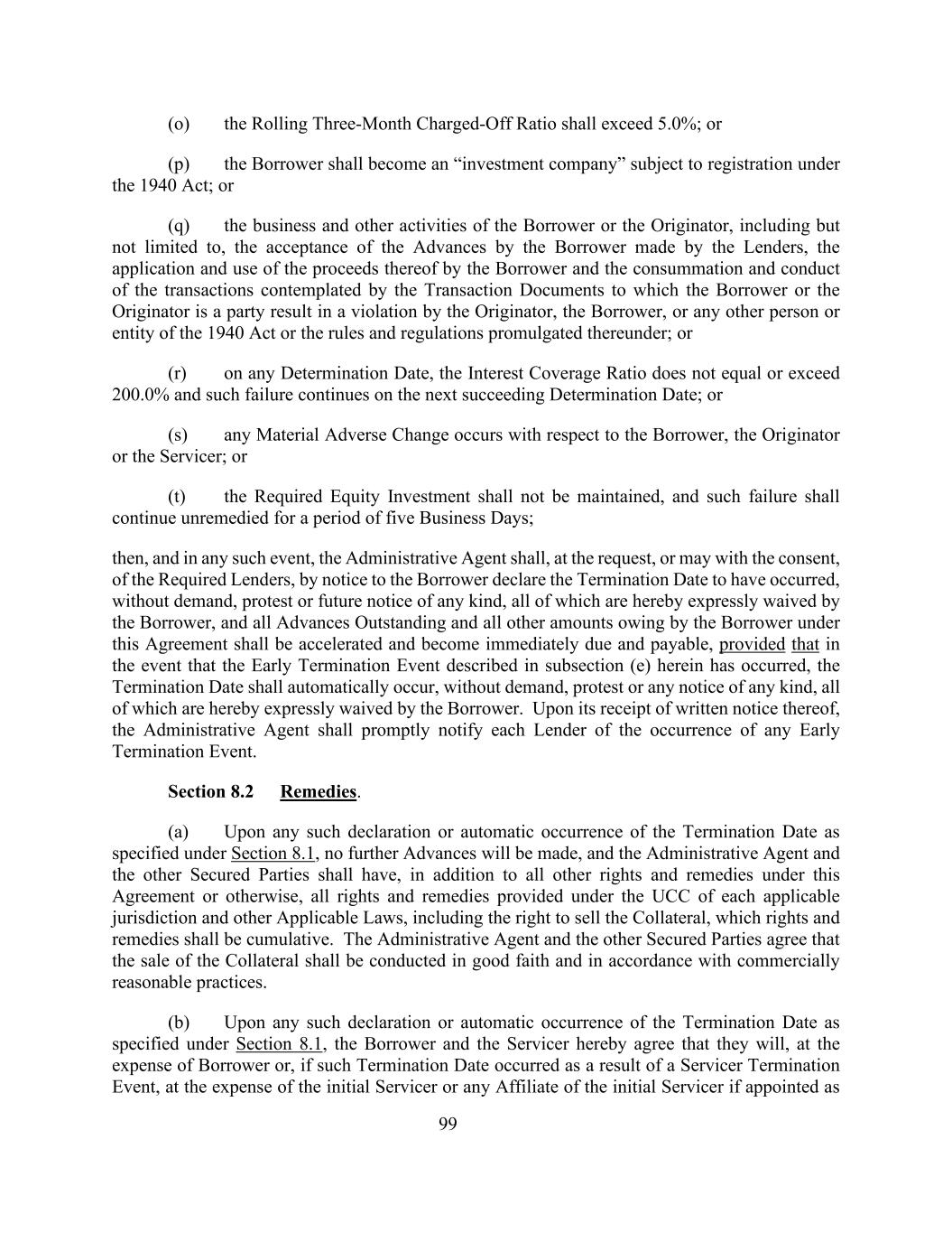 99(o)三个月滚动核销比例应超过5.0%;或(p)借款人应成为根据1940年法案进行登记的“投资公司”;或(q)借款人或发起人的业务和其他活动,包括但不限于借款人接受贷款人作出的垫款、借款人申请和使用其收益以及完成和进行借款人或发起人作为一方当事人的交易文件所设想的交易,导致发起人、借款人违规,或1940年法案或根据该法案颁布的规则和条例的任何其他个人或实体;或(r)在任何确定日期,利息覆盖率不等于或超过200.0%且此种失败在下一个确定日期继续存在;或(s)借款人、发起人或服务人发生任何重大不利变化;或(t)所要求的股权投资不得维持,且此种失败应在五个工作日内继续未得到补救;然后,在任何此种情况下,行政代理人应请求,或可在获规定贷款人同意下,藉向借款人发出通知而宣布终止日期已发生,而无须要求、抗议或任何种类的未来通知,所有这些均由借款人特此明确放弃,借款人根据本协议欠下的所有垫款和所有其他款项应加速并立即到期应付,但条件是在发生本(e)款所述提前终止事件的情况下,终止日期应自动发生,而无须要求、抗议或任何种类的通知,所有这些都特此由借款人明确放弃。行政代理人收到提前终止事件的书面通知后,应当及时将提前终止事件的发生情况通知各出借人。第8.2节补救办法。(a)一旦根据第8.1节规定的任何此类声明或终止日期自动发生,将不再进行垫款,并且除本协议或其他规定的所有其他权利和补救措施外,行政代理人和其他有担保当事人应拥有根据每个适用司法管辖区的UCC和其他适用法律提供的所有权利和补救措施,包括出售抵押品的权利,这些权利和补救措施应是累积的。行政代理人与其他有担保当事人约定,抵押物的出售应当本着善意,按照商业上合理的做法进行。(b)一旦根据第8.1条指明的终止日期发生任何该等声明或自动发生,借款人及服务人特此同意,他们将由借款人承担费用,如该终止日期是由于服务人终止事件而发生,则由初始服务人或初始服务人的任何附属公司承担费用(如获委任为