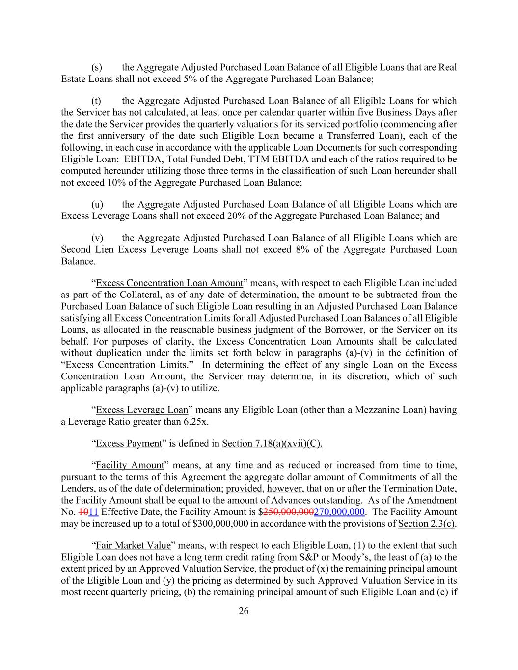 26(s)属于房地产贷款的所有合格贷款的调整后购买贷款余额总额不得超过已购买贷款余额总额的5%;(t)服务人未计算的所有合格贷款的调整后购买贷款余额总额,在服务人为其所服务的投资组合提供季度估值之日后的五个工作日内,至少每个日历季度一次(从该合格贷款成为已转让贷款之日起一周年后开始),以下各条,在每种情况下,按照适用的贷款文件为这类相应的合格贷款:EBITDA,融资债务总额,TTM EBITDA以及本协议项下使用该等贷款分类中这三个术语要求计算的各项比率,不得超过总购买贷款余额的10%;(u)属于超额杠杆贷款的所有符合条件的贷款的调整后总购买贷款余额不得超过总购买贷款余额的20%;(v)属于第二留置权超额杠杆贷款的所有符合条件的贷款的调整后总购买贷款余额不得超过总购买贷款余额的8%。“超额集中贷款金额”是指,就作为抵押品一部分包括的每笔合格贷款而言,截至任何确定日期,从该合格贷款的已购买贷款余额中减去的金额导致调整后的已购买贷款余额满足所有合格贷款的所有调整后已购买贷款余额的所有超额集中限制,按借款人或代其分配的服务商的合理商业判断进行分配。为明确起见,超额集中贷款金额应在下文(a)-(v)段“超额集中限额”定义中规定的限额下计算,不得重复。在确定任何单一贷款对超额集中贷款金额的影响时,服务人可酌情决定使用该等适用的(a)-(v)款中的哪一款。“超额杠杆贷款”是指杠杆率大于6.25x的任何符合条件的贷款(夹层贷款除外)。“超额支付”在第7.18(a)(xvii)(c)节中定义。“融资金额”是指,根据本协议的条款,在任何时候并随着时间的减少或增加,截至确定之日,所有贷款人的承诺美元总额;但条件是,在终止日期或之后,融资金额应等于未偿还的预付款金额。截至第1011号修正案生效之日,融资金额为250,000,000270,000,000美元。根据第2.3(c)节的规定,融资额度可增加至总额300,000,000美元。“公允市场价值”是指,就每笔合资格贷款而言,(1)在该等合资格贷款并无标普或穆迪的长期信用评级的情况下,(a)在认可估值服务定价的范围内,(x)合资格贷款的剩余本金额与(y)该认可估值服务在其最近一个季度定价中确定的定价的乘积,(b)该等合资格贷款的剩余本金额及(c)如果