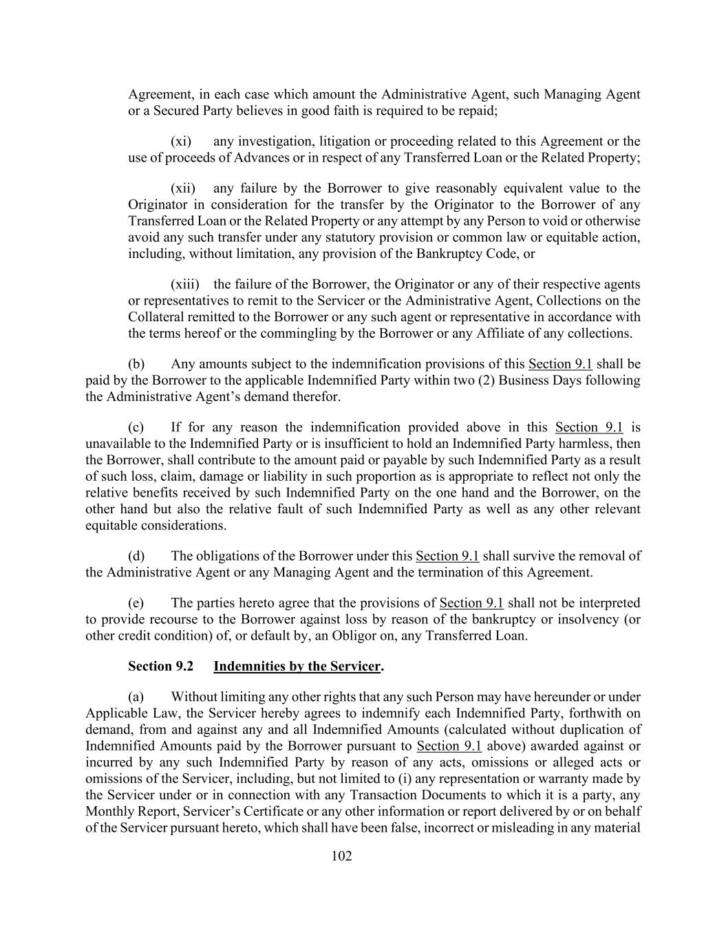 102协议,在每一种情况下,金额为行政代理人、该管理代理人或有担保方善意相信的,均需予以偿还;(xi)任何调查,与本协议或使用垫款所得款项或与任何已转让贷款或相关财产有关的诉讼或程序;(xii)借款人未能就发起人向借款人转让任何已转让贷款或相关财产的代价向发起人给予合理等值的任何诉讼或程序,或任何人试图根据任何法定条文或普通法或衡平法诉讼(包括但不限于《破产法》的任何条文)作废或以其他方式避免任何该等转让,或(xiii)借款人未能,发起人或其各自的任何代理人或代表根据本协议的条款或由借款人或任何关联人混合任何托收而向服务人或行政代理人汇出的抵押品上的托收。(b)任何受本条第9.1条赔偿条文规限的款额,须由借款人在行政代理人提出要求后的两(2)个营业日内,向适用的获弥偿方支付。(c)如因任何理由,上述第9.1节所规定的赔偿不能提供给受弥偿方或不足以使受弥偿方免受损害,则借款人须按适当比例分摊该受弥偿方因该等损失、申索、损害或赔偿责任而已支付或应付的款额,以反映该受弥偿方一方面和借款人所获得的相对利益,另一方面也反映该受弥偿方的相对过失以及任何其他相关衡平法考虑。(d)借款人根据本条第9.1款承担的义务在行政代理人或任何管理代理人被解除职务和本协议终止后仍然有效。(e)双方同意,不得将第9.1节的规定解释为对借款人因任何转让贷款的破产或无力偿债(或其他信用条件)或债务人违约而造成的损失提供追索权。第9.2节服务商的赔偿。(a)在不限制任何该等人根据本协议或根据适用法律可能拥有的任何其他权利的情况下,服务人特此同意根据要求立即向每名获弥偿方作出弥偿,补偿其因服务人的任何作为、不作为或指称的作为或不作为(包括,但不限于(i)服务商根据或与其作为一方的任何交易文件、任何月度报告、服务商证书或由或代表服务商依据本协议交付的任何其他信息或报告作出的任何陈述或保证,而该等陈述或保证在任何材料中应已属虚假、不正确或具有误导性