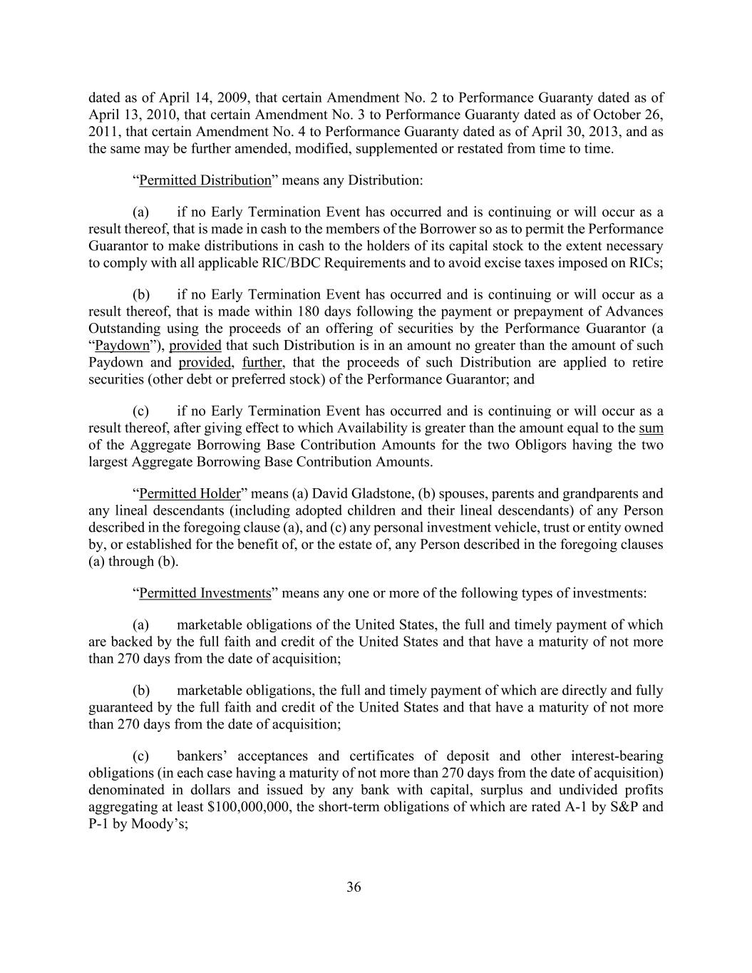 截至2009年4月14日的第36条、截至2010年4月13日的履约担保的第2号若干修订、截至2011年10月26日的履约担保的第3号若干修订、截至2013年4月30日的履约担保的第4号若干修订,并视情况不时进一步修订、修改、补充或重述。“允许分配”是指任何分配:(a)如果没有发生提前终止事件并且正在继续或将因此发生,即以现金方式向借款人成员进行,以便允许履约担保人在遵守所有适用的RIC/BDC要求和避免对RIC征收的消费税所需的范围内以现金方式向其股本持有人进行分配;(b)如果没有发生提前终止事件并且正在继续或将因此发生,指在使用履约担保人发行证券所得款项支付或提前支付未偿预付款(“付款”)后的180天内进行,但前提是此类分配的金额不超过此类付款的金额,并进一步规定此类分配所得款项用于退还履约担保人的证券(其他债务或优先股);(c)如果没有发生提前终止事件,并且正在继续或将因此发生,生效后的可得性大于两个拥有最大总借款基础贡献金额的两个义务人的总借款基础贡献金额之和的金额。“许可持有人”是指(a)David Gladstone,(b)上述(a)条所述任何人的配偶、父母和祖父母以及任何直系后代(包括收养的子女及其直系后代),以及(c)由上述(a)至(b)条所述任何人拥有或为其利益而设立的任何个人投资工具、信托或实体,或为其遗产而设立的任何个人投资工具、信托或实体。“许可投资”是指下列任何一种或多种投资:(a)美国的可销售债务,其全额和及时付款有美国的完全信用和信用支持,期限自收购之日起不超过270天;(b)可销售债务,全额和及时付款由美国的完全信用和信用直接和充分保证,且期限自购置之日起不超过270天;(c)银行承兑汇票、存单和其他计息债务(在每种情况下的期限不超过自购置之日起270天),以美元计价,由任何银行发行,资本、盈余和未分割利润合计至少100,000,000美元,其短期债务被标普评为A-1,被穆迪评为P-1;