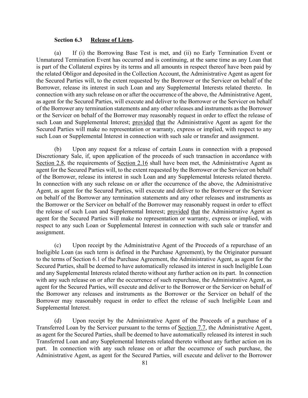 81第6.3节留置权的解除。(a)如果(i)借款基础测试得到满足,并且(ii)没有发生提前终止事件或未到期的终止事件并且仍在继续,在作为抵押品一部分的任何贷款按其条款到期且与此相关的所有金额已由相关债务人支付并存入收款账户的同时,作为担保当事人代理人的行政代理人将在借款人或代表借款人的服务人要求的范围内解除其在该贷款中的利息以及与此相关的任何补充利息。就上述情况发生之日或之后的任何此类解除而言,行政代理人作为有担保当事人的代理人,将代表借款人执行并向借款人或服务人交付借款人或代表借款人的服务人可能合理要求的任何终止声明和任何其他解除和文书,以实现此类贷款和补充利息的解除;但作为有担保当事人代理人的行政代理人不会作出任何明示或默示的陈述或保证,就与该等出售或转让及转让有关的任何该等贷款或补充权益而言。(b)在提出与拟议全权出售有关的某些贷款解除的任何请求时,如果按照第2.8节的规定申请此类交易的收益,应已满足第2.16节的要求,作为担保当事人代理人的行政代理人将在借款人或代表借款人的服务人要求的范围内,解除其在此类贷款中的权益以及与此相关的任何补充权益。就上述情况发生之日或之后的任何此类解除而言,行政代理人作为有担保当事人的代理人,将代表借款人执行并向借款人或服务人交付借款人或代表借款人的服务人可能合理要求的任何终止声明和任何其他解除和文书,以实现此类贷款和补充利息的解除;但作为有担保当事人代理人的行政代理人不会作出任何明示或默示的陈述或保证,就与该等出售或转让及转让有关的任何该等贷款或补充权益而言。(c)在行政代理人根据购买协议第6.1节的条款收到回购不合格贷款(如购买协议中定义的该术语)的收益后,发起人应视为行政代理人作为有担保当事人的代理人自动解除其在该不合格贷款中的权益以及与之相关的任何补充权益,而无需其采取任何进一步行动。就任何此类解除而言,在此类回购发生时或之后,行政代理人作为有担保当事人的代理人,将代表借款人执行并向借款人或服务人交付借款人或代表借款人的服务人可能合理要求的任何解除和票据,以实现此类不合格贷款和补充利息的解除。(d)行政代理人根据第7.7节的条款收到服务人购买转让贷款的收益后,该行政代理人作为有担保当事人的代理人,应被视为自动解除其在该转让贷款中的权益以及与之相关的任何补充权益,而无需其采取任何进一步行动。在此类购买发生时或之后,就任何此类解除而言,行政代理人作为有担保当事人的代理人,将执行并交付给借款人