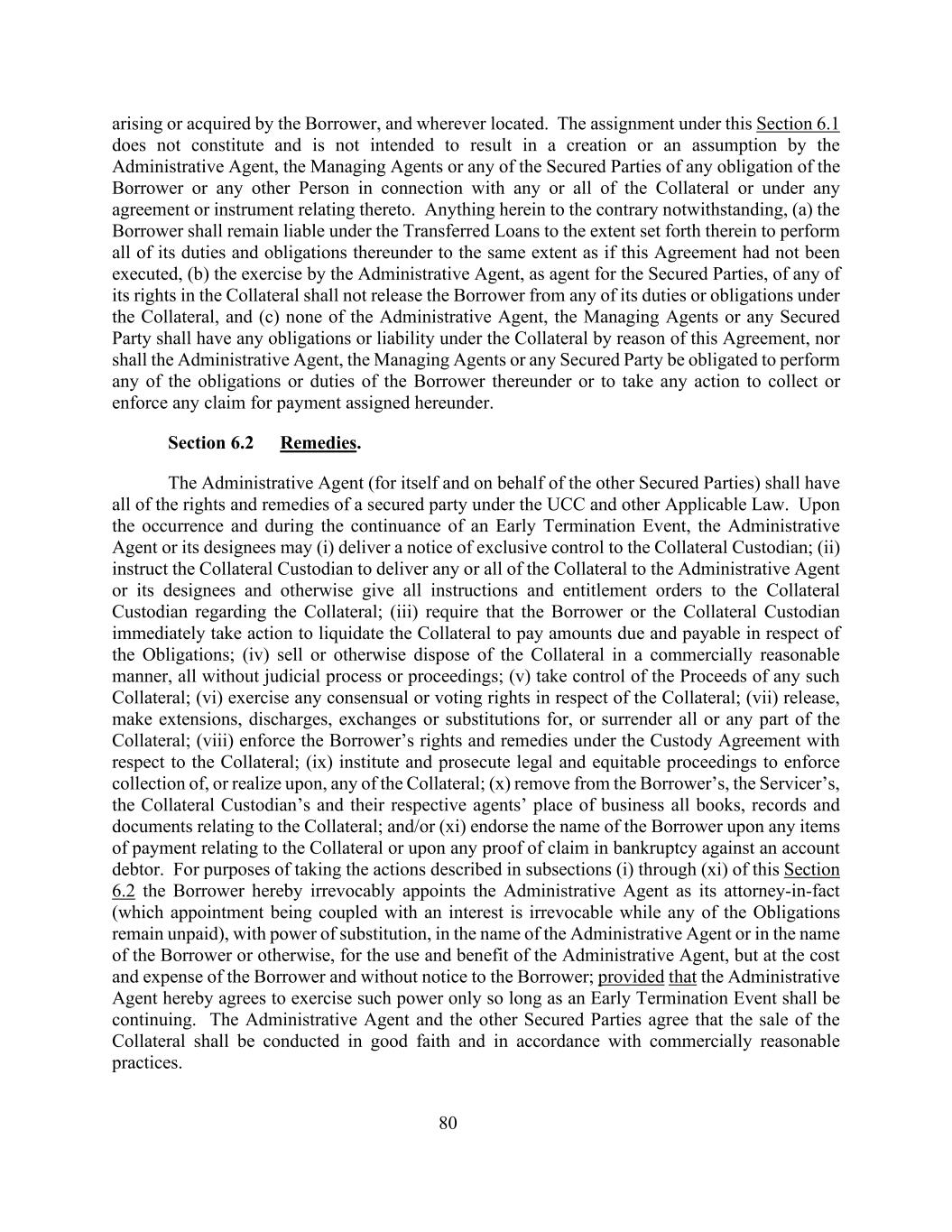 由借款人产生或获得的80,以及位于何处。根据本条第6.1款进行的转让不构成也不打算导致行政代理人、管理代理人或任何有担保当事人设定或承担借款人或任何其他人与任何或所有担保物有关的任何义务或根据与此有关的任何协议或文书承担的义务。尽管本协议中有任何相反的规定,(a)借款人仍应在转让贷款项下承担责任,以履行其在转让贷款项下的所有职责和义务,其程度与未执行本协议的程度相同,(b)行政代理人作为有担保方的代理人行使其在担保物上的任何权利,不应解除借款人在担保物项下的任何职责或义务,以及(c)该行政代理人中没有任何一人,管理代理人或任何有担保方因本协议而在担保物项下承担任何义务或责任,行政代理人、管理代理人或任何有担保方也无义务履行借款人在本协议项下的任何义务或义务,或采取任何行动收取或强制执行根据本协议转让的任何付款索赔。第6.2节补救办法。行政代理人(为其本人和代表其他有担保方)享有有担保方在UCC和其他适用法律下的所有权利和救济。在提前终止事件发生时和持续期间,行政代理人或其指定人可(i)向抵押品托管人交付专属控制权通知;(ii)指示抵押品托管人向行政代理人或其指定人交付任何或全部抵押品,并以其他方式向抵押品托管人发出关于抵押品的所有指示和权利命令;(iii)要求借款人或抵押品托管人立即采取行动清算抵押品,以支付与债务相关的到期应付款项;(iv)以商业上合理的方式出售或以其他方式处置抵押品,所有未经司法程序或程序;(v)控制任何该等抵押品的收益;(vi)就该抵押品行使任何合意或表决权;(vii)解除、延期、解除、交换或替代,或交出该抵押品的全部或任何部分;(viii)强制执行借款人根据托管协议就该抵押品享有的权利和补救措施;(ix)提起和起诉法律和衡平法程序,以强制收取或变现任何该抵押品;(x)从借款人、服务人、抵押品托管人及其各自代理人的营业地与抵押品有关的所有簿册、记录和文件;和/或(xi)在与抵押品有关的任何付款项目上或在针对账户债务人的任何破产债权证明上为借款人的名称背书。为采取本条第6.2条第(i)至(xi)款所述的行动,借款人在此不可撤销地指定行政代理人为其事实上的代理人(在任何义务仍未得到偿付的情况下,该任命与利益相结合是不可撤销的),并具有替代权,以行政代理人的名义或以借款人的名义或其他方式,为行政代理人的使用和利益,但由借款人承担成本和费用,且不通知借款人;但行政代理人特此同意仅在提前终止事件仍在继续的情况下行使该权力。行政代理人与其他有担保当事人约定,抵押物的出售应当本着善意,按照商业上合理的做法进行。