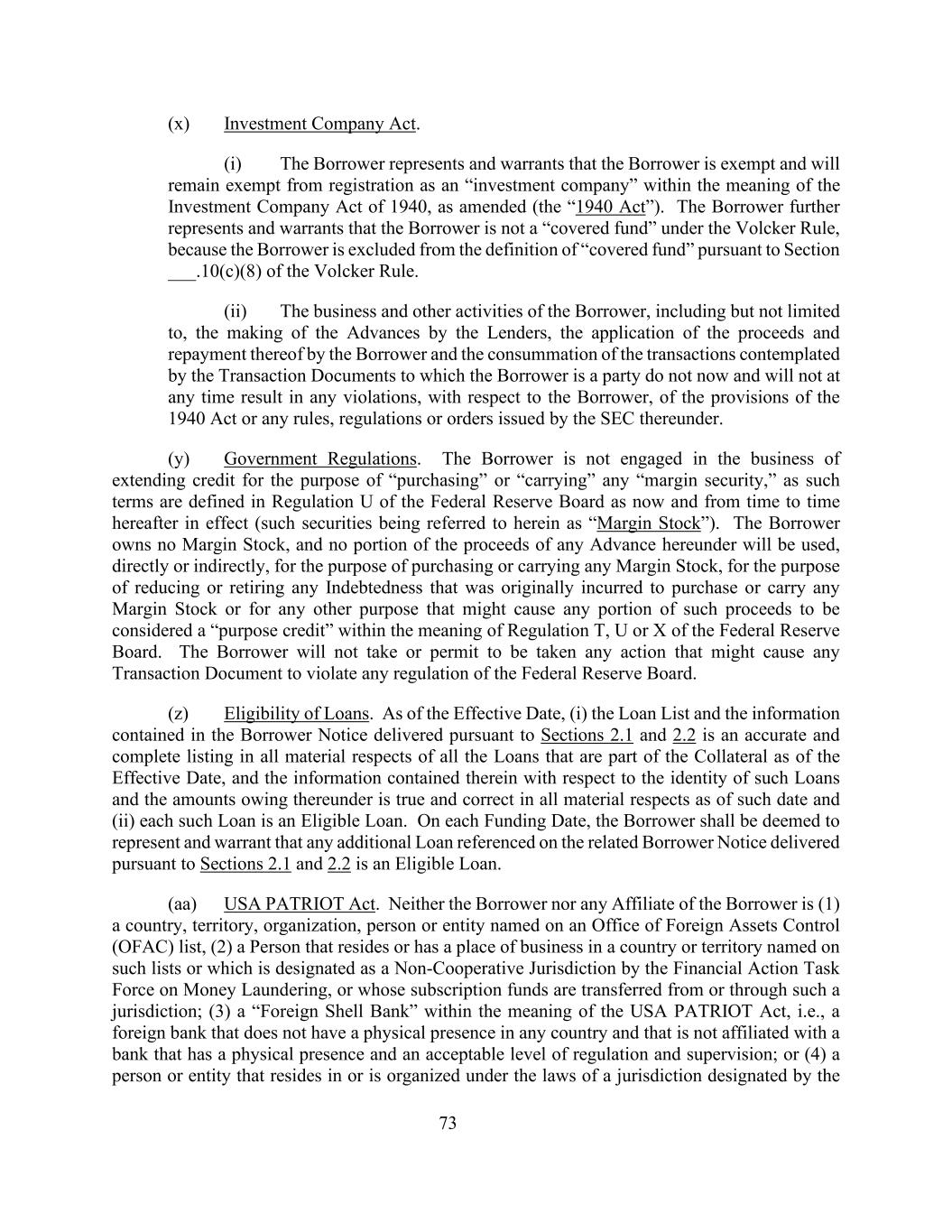 73(x)投资公司法。(i)借款人声明并保证,借款人获得豁免,并将继续免于登记为经修订的1940年《投资公司法》(“1940年法”)所指的“投资公司”。借款人进一步声明并保证,借款人不是沃尔克规则下的“担保基金”,因为根据沃尔克规则第____.10(c)(8)节,借款人被排除在“担保基金”的定义之外。(二)借款人的业务和其他活动,包括但不限于贷款人垫款、借款人申请收益和偿还收益以及完成借款人作为当事方的交易文件所设想的交易,现在不会也不会在任何时候导致借款人违反1940年法案的规定或SEC根据该法案发布的任何规则、条例或命令。(y)政府条例。借款人不从事以“购买”或“携带”任何“保证金证券”为目的提供信贷的业务,因为这些术语在美国联邦储备委员会条例U中定义为现在和以后不时生效(此类证券在本文中称为“保证金股票”)。借款人不拥有保证金股票,本协议项下任何预付款的收益的任何部分都不会直接或间接用于购买或持有任何保证金股票的目的,以减少或偿还最初因购买或持有任何保证金股票而产生的任何债务,或用于可能导致此类收益的任何部分被视为联邦储备委员会条例T、U或X含义内的“目的信贷”的任何其他目的。借款人将不会采取或允许被采取任何可能导致任何交易文件违反联邦储备委员会任何规定的行动。(z)贷款资格。截至生效日期,(i)根据第2.1和2.2节交付的贷款清单和借款人通知中包含的信息是截至生效日期属于抵押品一部分的所有贷款在所有重大方面的准确和完整的清单,其中包含的关于此类贷款的身份及其项下所欠金额的信息在该日期的所有重大方面是真实和正确的,并且(ii)每笔此类贷款都是合格贷款。在每个资助日期,借款人应被视为声明并保证根据第2.1和2.2节交付的相关借款人通知中提及的任何额外贷款为合格贷款。(aa)美国爱国者法案。借款人或借款人的任何附属机构都不是(1)外国资产管制办公室(OFAC)名单上所列的国家、领土、组织、个人或实体,(2)居住在或拥有营业地在此类名单上所列的国家或领土或被反洗钱金融行动特别工作组指定为非合作司法管辖区的人,或其认购资金从或通过此类司法管辖区转移;(3)《美国爱国者法案》所指的“外国贝壳银行”,即,在任何国家没有实体存在的外国银行,且不隶属于具有实体存在和可接受的监管水平的银行;或(4)居住在或根据《公约》指定的法域的法律组建的个人或实体