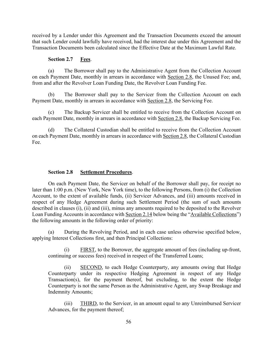 贷款人根据本协议和交易文件收到的56超过了该贷款人可以合法收到的金额,前提是本协议和交易文件项下的到期利息自生效之日起按最高合法利率计算。第2.7节费用。(a)借款人应在每个付款日期从收款账户向行政代理人支付未使用的费用,每月按第2.8节拖欠;以及自循环贷款供资日期起及之后的循环贷款供资费用。(b)借款人须于每个付款日期,按照第2.8节的规定,按月从收款帐户向服务人支付服务费。(c)根据第2.8节的规定,备用服务商有权在每个付款日期从收款账户每月收取备用服务费。(d)抵押品托管人有权在每个付款日期从收款账户收取抵押品托管费,按照第2.8节按月拖欠。第2.8节结算程序。在每个付款日期,代表借款人的服务商应在不迟于下午1:00(纽约、纽约时间)之前从(i)收款账户(以可用资金为限)向以下人员付款,(ii)服务商预付款,以及(iii)在该结算期内就任何对冲协议收到的金额(第(i)、(ii)和(iii)条所述的此类金额的总和,减去根据下文第2.14节要求存入循环贷款融资账户的任何金额,即“可用收款”)以下金额,按以下优先顺序排列:(a)在循环期内,在每种情况下,除非下文另有规定,先收取利息,然后收取本金:(i)首先,向借款人收取就所转让贷款收取的费用总额(包括前期、持续或成功费用);(ii)第二,向每个对冲对手方,就任何对冲交易根据其各自的对冲协议欠该对冲对手方的任何金额,为支付,但在对冲交易对手与行政代理人不是同一人的范围内,不包括任何掉期违约和赔偿金额;(iii)第三,向服务商支付相当于任何未偿还的服务商预付款的金额,以支付该款项;