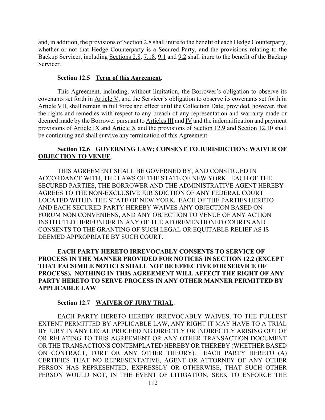 112.此外,第2.8节的规定应对每一对冲对手方有利,无论该对冲对手方是否为有担保方,与备用服务商有关的规定,包括第2.8节、7.18节、9.1节和9.2节应对备用服务商有利。本协议第12.5节条款。本协议,包括但不限于借款人遵守第五条规定的约定的义务和服务人遵守第七条规定的约定的义务,在收取之日之前保持完全有效;但前提是,就任何违反借款人根据第三条和第四条以及第九条和第十条的赔偿和付款规定以及第12.9条和第12.10条的规定作出或视为作出的任何陈述和保证的行为而言,权利和补救措施应继续存在,并应在本协议的任何终止后继续有效。第12.6节管辖法律;同意管辖权;放弃对地点的反对。本协议应受纽约州法律管辖,并根据纽约州法律进行构建。每个被担保方、借款人和行政代理人特此同意位于纽约州境内的任何联邦法院的非排他性管辖权。此处的每一方和此处的每一有担保方均放弃基于论坛非会议规则的任何反对,以及在上述任何法院根据此处提起的任何诉讼的任何地点的任何反对,并同意授予该法院认为适当的此类法律或公平救济。此处的每一方均不可撤销地同意以第12.2节中为通知规定的方式送达流程(但传真通知不应对流程服务有效)。本协议中的任何内容均不影响本协议任何一方以适用法律允许的任何其他方式服务过程的权利。第12.7节放弃陪审团审判。本协议每一方在此不可撤销地放弃在适用法律允许的最充分范围内,在直接或间接产生于或与本协议或任何其他交易文件或由此设想的交易(无论是基于合同、侵权或任何其他理论)有关的任何法律程序中其可能拥有的由陪审团审判的任何权利。此处的每一方(a)证明没有任何其他人的代表、代理人或代理人明示或以其他方式代表该其他人在发生诉讼时不会寻求强制执行