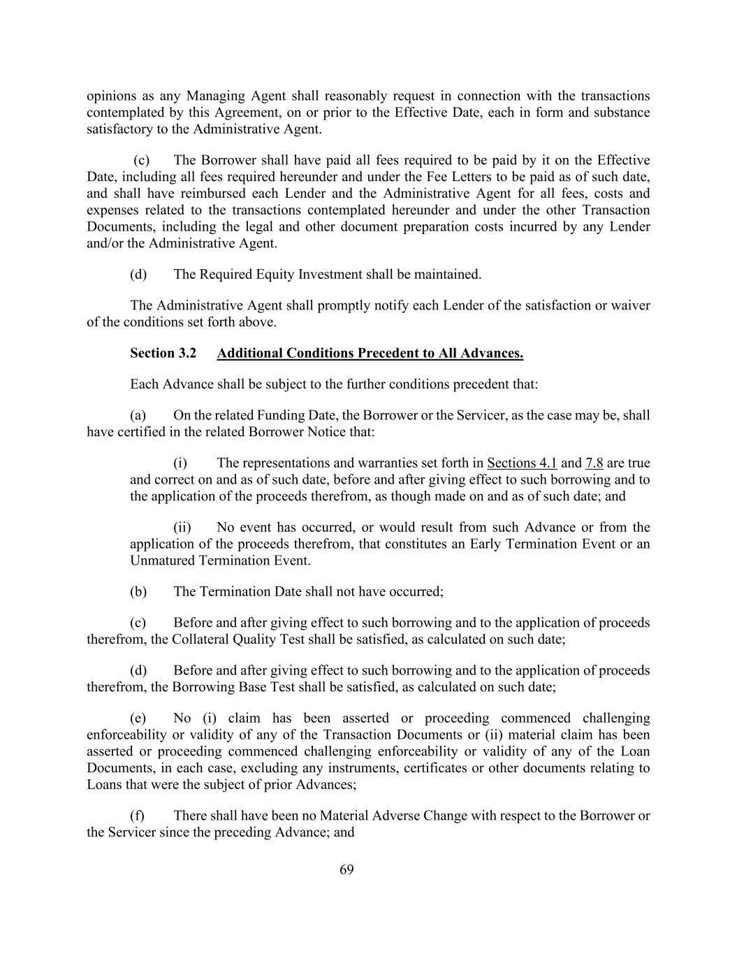 69条意见作为任何管理代理人,应在生效日期或之前就本协议所设想的交易合理请求,每一条意见的形式和实质内容均令行政代理人满意。(c)借款人应已支付其在生效日期须支付的所有费用,包括根据本协议和截至该日期须支付的费用函件项下所要求的所有费用,并应已向每个贷款人和行政代理人偿还与本协议和其他交易文件项下所设想的交易有关的所有费用、成本和开支,包括任何贷款人和/或行政代理人所招致的法律费用和其他文件编制费用。(d)应维持所需的股权投资。行政代理人应当将上述条件的满足或者放弃情况及时通知各出借人。第3.2节所有垫款的先决条件附加条件。每项垫款须受以下进一步先决条件规限:(a)在有关的供款日期,借款人或服务人(视属何情况而定)须已在有关借款人通知书中证明:(i)第4.1及7.8条所载的陈述及保证在该日期、在该等借款生效之前及之后以及在该等借款的收益适用之前及之后均属真实及正确,犹如在该日期及截至该日期作出;及(ii)并无发生任何事件,或将由该等垫款或其所得款项的应用所致,构成提前终止事件或未到期终止事件。(b)终止日期不应已发生;(c)在实施该等借款及其所得款项运用之前及之后,抵押品质量测试须获满足,按该日期计算;(d)在实施该等借款及其所得款项运用之前及之后,借款基础测试须获满足,按该日期计算;(e)没有(i)主张索赔或启动程序质疑任何交易文件的可执行性或有效性,或(ii)已主张重大索赔或启动程序质疑任何贷款文件的可执行性或有效性,在每种情况下,不包括先前垫款标的的与贷款有关的任何文书、证书或其他文件;(f)自先前垫款以来,借款人或服务商不存在重大不利变化;和