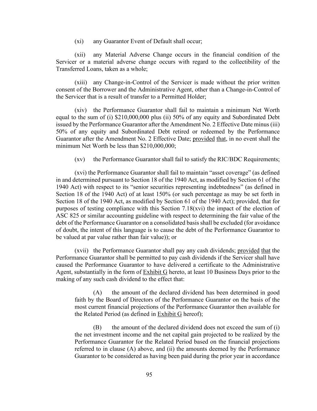 95(xi)发生任何担保人违约事件;(xii)服务人的财务状况发生任何重大不利变化或就所转让贷款的可收回性发生重大不利变化,作为一个整体;(xiii)服务人的任何控制权变更是在未经借款人和行政代理人事先书面同意的情况下作出的,因转让给许可持有人而导致的服务商控制权变更除外;(xiv)履约担保人不得保持最低净值等于(i)210,000,000美元加上(ii)履约担保人在第2号修订生效日期后发行的任何股权和次级债务的50%减去(iii)履约担保人在第2号修订生效日期后退休或赎回的任何股权和次级债务的50%;但,在任何情况下,最低净值均不得低于210,000,000美元;(xv)履约担保人不得满足RIC/BDC要求;(xvi)履约担保人不得就其“代表债务的优先证券”(定义见1940年法案第18条,经1940年法案第61条修改)保持至少150%(或1940年法案第18条可能规定的百分比)的“资产覆盖率”(定义见1940年法案第18条并根据该条确定,经1940年法案第61条修改);但为测试是否符合本第7.18(xvi)条的规定,应排除选择ASC 825或类似会计准则对确定履约担保人在合并基础上的债务公允价值的影响(为免生疑问,这种语言的意图是导致履约担保人的债务按面值估值,而不是按公允价值估值));或(xvii)履约担保人应支付任何现金股息;但如果履约担保人应已导致履约担保人已向行政代理人交付证书,且基本上以本协议的附件 G形式交付,则应允许履约担保人支付现金股息,在进行任何该等现金股息前至少10个营业日,其大意为:(a)已宣布的股息金额已由履约保证人的董事会根据履约保证人当时可获得的相关期间(定义见本协议的附件 g)的最当前财务预测善意地确定;(b)已宣布的股息金额不超过(i)净投资收益之和及履约保证人根据上文(a)条所指的财务预测预计在相关期间实现的净资本收益,及(ii)履约保证人认为在上一年度已按照