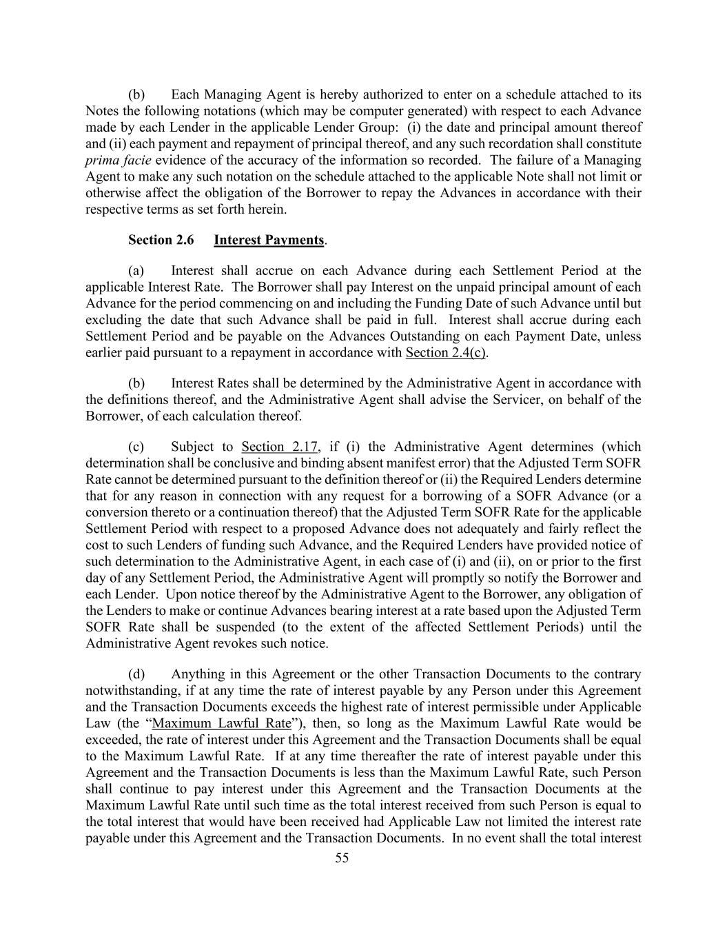 55(b)特此授权每名管理代理人在其附注所附的附表上,就适用的贷款集团中每名贷款人作出的每笔垫款记入以下记号(可能是计算机生成的):(i)其日期和本金数额,以及(ii)其每笔本金的支付和偿还,任何此类记录应构成如此记录的信息准确性的表面证据。管理代理人未能在适用票据所附的附表上作出任何此类注明,不应限制或以其他方式影响借款人按照本文件规定的各自条款偿还垫款的义务。第2.6节利息支付。(a)在每个结算期内,每笔预付款应按适用的利率计息。借款人应就每笔垫款的未付本金支付自该垫款的供资日(包括该日)开始的期间的利息,直至但不包括该垫款应全额支付之日。利息应在每个结算期内累积,并应在每个支付日就未偿还的预付款支付,除非根据根据第2.4(c)节的还款提前支付。(b)利率应由行政代理人按照其定义确定,行政代理人应代表借款人将每一次计算通知服务人。(c)除第2.17条另有规定外,如果(i)行政代理人确定(该确定应是决定性的且无明显错误的情况下具有约束力)无法根据其定义确定调整后的定期SOFR利率,或(ii)所需贷款人确定,出于与任何请求借入SOFR预付款(或转换为其或其延续)有关的任何原因,拟议预付款的适用结算期的调整后定期SOFR利率没有充分和公平地反映此类贷款人为此类预付款提供资金的成本,而规定的贷款人已向行政代理人提供有关该等决定的通知,在(i)及(ii)的每宗个案中,在任何结算期的第一天或之前,行政代理人将迅速如此通知借款人及每名贷款人。经行政代理人向借款人发出通知,贷款人按调整后的定期SOFR利率支付或继续支付有息垫款的任何义务应暂停(以受影响的结算期为限),直至行政代理人撤销该通知。(d)尽管本协议或其他交易文件中有任何相反的规定,但如果在任何时候任何人根据本协议和交易文件应支付的利率超过适用法律允许的最高利率(“最高合法利率”),那么,只要超过最高合法利率,本协议和交易文件下的利率应等于最高合法利率。如其后任何时间根据本协议及交易文件应付的利率低于最高法定利率,则该人应继续按最高法定利率支付本协议及交易文件项下的利息,直至从该人收到的利息总额等于如果适用法律不限制本协议及交易文件项下应付的利率本应收到的利息总额为止。在任何情况下均不得将总利息
