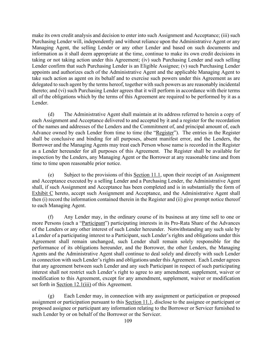109自行作出信用分析和决定,以订立该转让和接受;(iii)该购买贷款人将独立且不依赖行政代理人或任何管理代理人、出售贷款人或任何其他贷款人,并根据其当时认为适当的文件和资料,在根据本协议采取或不采取行动方面继续自行作出信贷决定;(iv)该采购贷款人及该销售贷款人确认该采购贷款人为合资格受让人;(v)该采购贷款人指定并授权行政代理人及适用的管理代理人各自以代理人身份代表其采取行动,并行使本协议条款授予该代理人的本协议项下的权力,连同合理附带的权力;及(vi)该等采购贷款人同意其将根据其条款履行本协议条款要求其作为贷款人履行的所有义务。(d)行政代理人应在其所提述的地址保存一份交付给其并由其接受的每项转让和接受的副本,以及一份登记册,用于记录贷款人的姓名和地址以及每个贷款人不时拥有的每笔垫款的承诺和本金金额(“登记册”)。登记册内的记项应是结论性的,对所有目的均具有约束力,不存在明显错误。就本协议的所有目的而言,贷款人、借款人和管理代理可将其姓名记录在登记册内的每个人视为本协议项下的贷款人。登记册应在任何合理时间并在合理的事先通知后不时供贷款人、任何管理代理人或借款人查阅。(e)在符合本条第11.1条规定的情况下,行政代理人在收到由销售贷款人和采购贷款人签立的转让和接受后,如该等转让和接受已完成,且实质上为本协议的附件 C形式,则该行政代理人应接受该等转让和接受,然后该行政代理人应(i)将其中所载信息记录在登记册中,并(ii)就此迅速通知各管理代理人。(f)任何贷款人可在其正常业务过程中,随时向一名或多名人士(各自为“参与者”)出售其按比例分享的贷款人垫款权益或该贷款人在本协议项下的任何其他权益。尽管出借人将参与权益出售给参与者,但该出借人在本协议下的权利和义务保持不变,该出借人仍应全权负责履行其在本协议下的义务,借款人、其他出借人、管理代理人和行政代理人应继续就该出借人在本协议下的权利和义务单独和直接与该出借人打交道。各贷款人同意,该贷款人与任何该等参与者就该等参与权益达成的任何协议不得限制该贷款人同意对本协议进行任何修订、补充、放弃或修改的权利,但本协议第12.1(iii)节规定的任何修订、补充、放弃或修改除外。(g)每一贷款人可就依据本条第11.1条进行的任何转让或参与或拟议的转让或参与,向受让人或参与人或拟议的受让人或参与人披露由借款人或服务人或其代表向该贷款人提供的与借款人或服务人有关的任何信息。