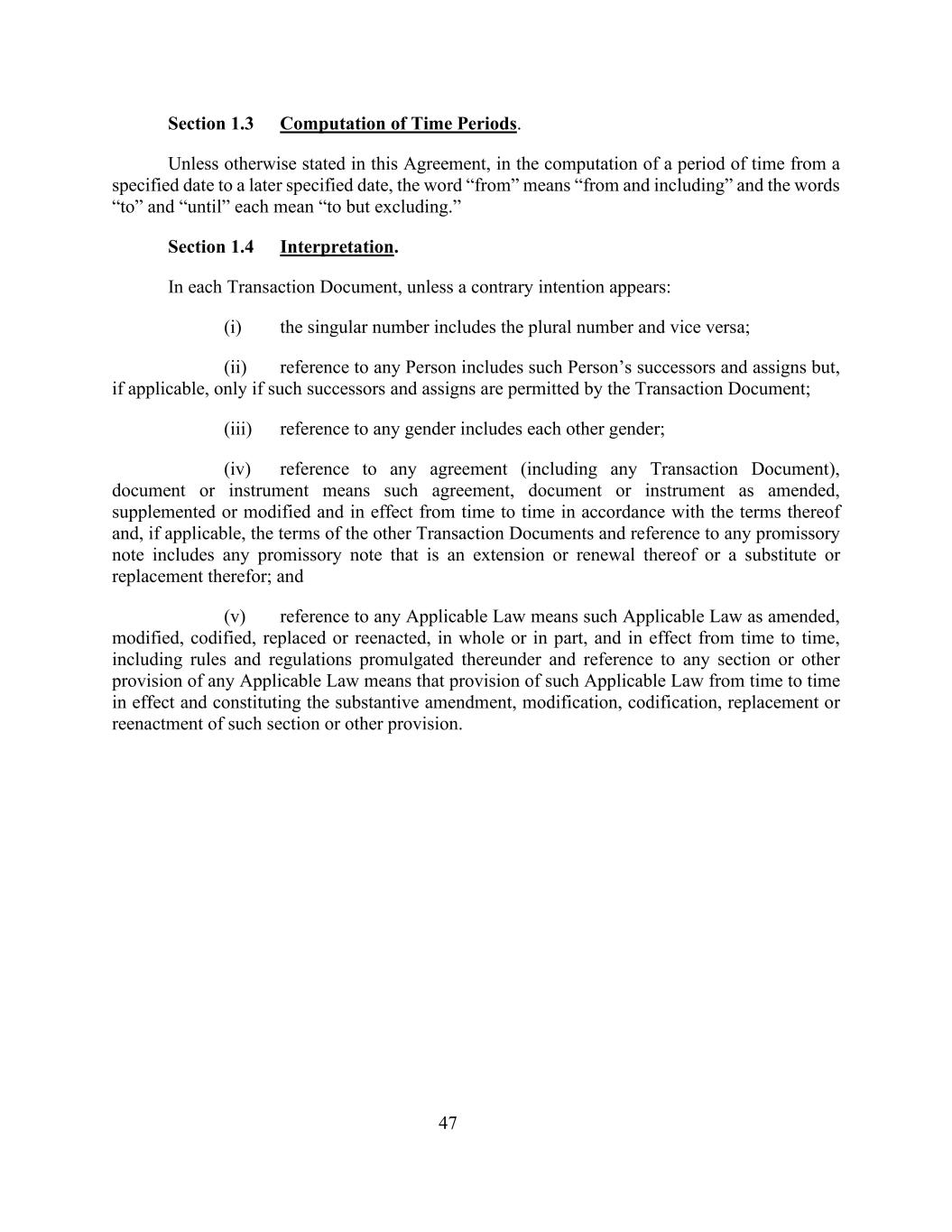 47第1.3节时间周期的计算。除非本协议另有规定,在计算从指定日期到以后指定日期的一段时间时,“从”一词表示“从并包括”,“到”和“直到”各表示“到但不包括”。第1.4节解释。在每份交易文件中,除非出现相反的意图:(i)单数包括复数,反之亦然;(ii)对任何人的提述包括该人的继承人和受让人,但如适用,则仅在该等继承人和受让人获得交易文件许可的情况下;(iii)对任何性别的提述包括彼此性别;(iv)对任何协议(包括任何交易文件)、文件或文书的提述是指经修订、补充或修改并根据其条款不时生效的该等协议、文件或文书,如适用,其他交易单证的条款和对任何本票的提述,包括作为其延期或续期或替代或替代的任何本票;(v)提述任何适用法律是指经修订、修改、编纂、取代或重新制定的全部或部分并不时生效的适用法律,包括据此颁布的规则和条例以及对任何适用法律的任何章节或其他规定的提述,是指该等适用法律不时生效并构成实质性修订、修改、编纂的规定,取代或重新制定该等条文或其他条文。