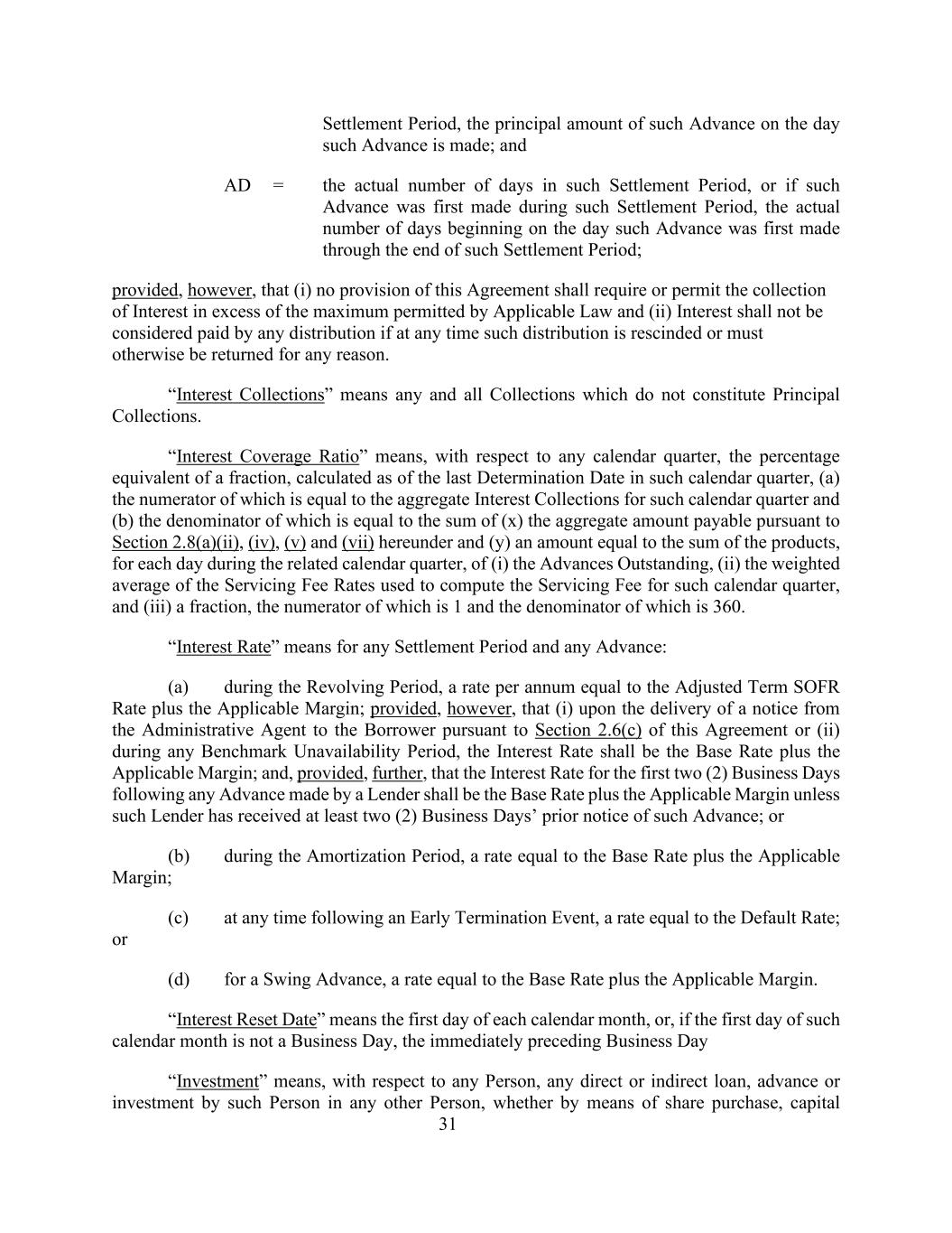 31结算期,预付款项当日的本金;及AD =该结算期内的实际天数,或该结算期内首次预付款项的,自首次预付款项当日起至该结算期结束的实际天数;但条件是,(i)本协议的任何条款均不得要求或允许收取超过适用法律允许的最高限额的利息,以及(ii)如果在任何时候因任何原因取消或必须以其他方式返还此类分配,则不应将利息视为通过任何分配支付。“利息催收”是指不构成本金催收的任何和所有催收。“利息覆盖率”是指,就任何日历季度而言,截至该日历季度的最后确定日期计算的相当于零头的百分比,(a)其分子等于该日历季度的利息收取总额,以及(b)其分母等于(x)根据本协议第2.8(a)(ii)、(iv)、(v)和(vii)节应付的总额和(y)在相关日历季度的每一天等于(i)未偿预付款的产品总和的金额,(ii)用于计算该日历季度服务费的服务费率的加权平均数,及(iii)一个分数,其分子为1,分母为360。“利率”是指任何结算期和任何预付款:(a)在循环期内,年利率等于调整后的定期SOFR利率加上适用的保证金;但前提是(i)在行政代理人根据本协议第2.6(c)节向借款人发出通知时或(ii)在任何基准不可用期间,利率应为基准利率加上适用的保证金;此外,前提是,贷款人作出任何垫款后的头两(2)个营业日的利率应为基准利率加上适用的保证金,除非该贷款人已收到至少两(2)个营业日的提前通知;或(b)在摊销期内,利率等于基准利率加上适用的保证金;(c)在提前终止事件后的任何时间,利率等于违约率;或(d)对于周转垫款,利率等于基准利率加上适用的保证金。“利息重置日期”指每个日历月的第一天,或者,如果该日历月的第一天不是营业日,则紧接的前一个营业日“投资”就任何人而言,指该人对任何其他人的任何直接或间接贷款、垫款或投资,无论是通过股份购买、资本