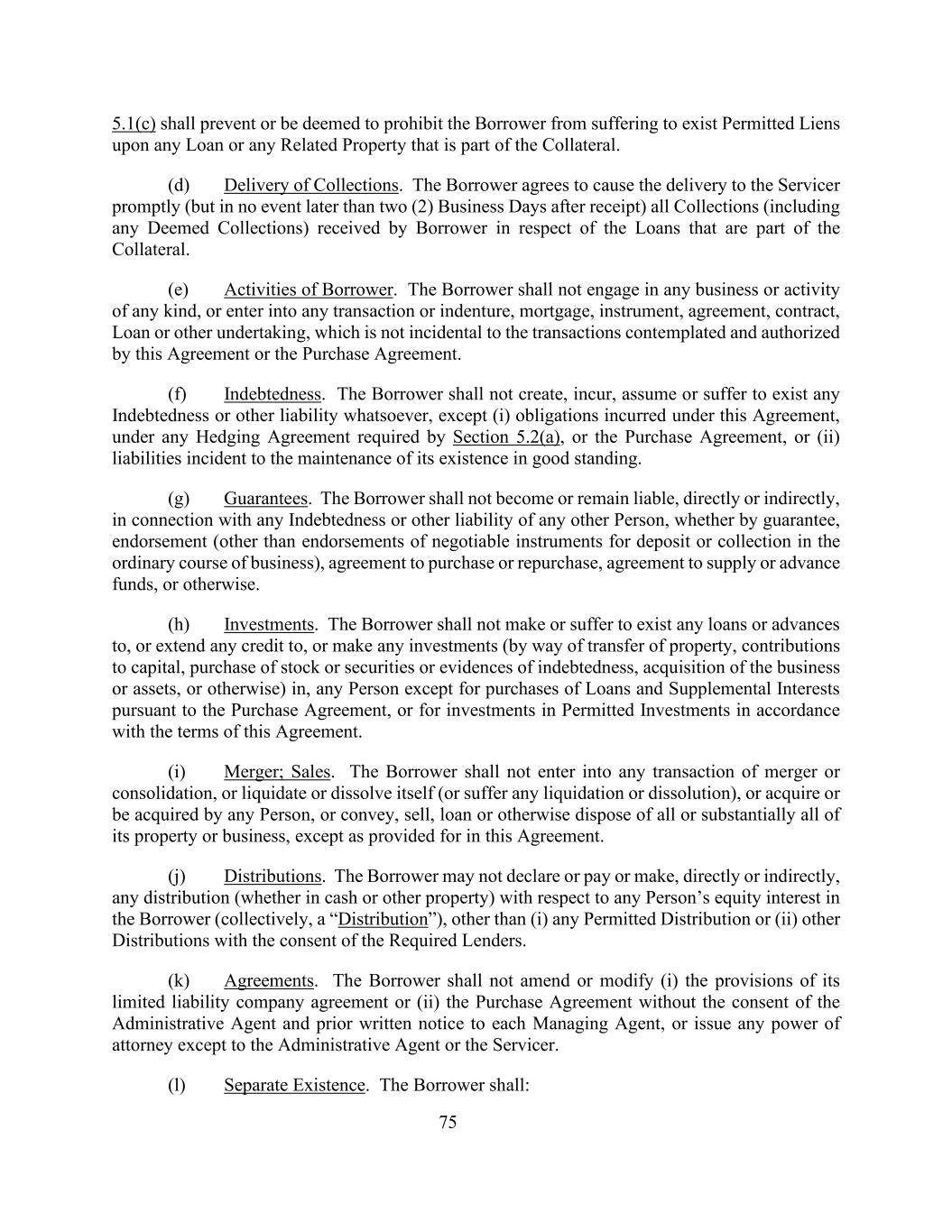 755.1(c)应防止或被视为禁止借款人对作为抵押品一部分的任何贷款或任何相关财产存在允许的留置权。(d)交付藏品。借款人同意促使迅速(但在任何情况下不得迟于收到后两(2)个工作日)将借款人就作为抵押品一部分的贷款收到的所有收款(包括任何视为收款)交付给服务商。(e)借款人的活动。借款人不得从事任何业务或任何种类的活动,或订立任何交易或契约、抵押、票据、协议、合同、贷款或其他承诺,而这与本协议或采购协议所设想和授权的交易无关。(f)负债。除(i)根据本协议、根据第5.2(a)节要求的任何套期保值协议或购买协议发生的义务,或(ii)因维持其良好信誉而发生的责任外,借款人不得设定、招致、承担或承受任何债务或其他责任。(g)担保。借款人不得因任何其他人的任何债务或其他责任而直接或间接承担或继续承担责任,不论是通过担保、背书(正常经营过程中存放或托收的可转让票据背书除外)、协议购买或回购、协议供应或垫付资金或其他方式。(h)投资。除根据购买协议购买贷款和补充权益外,或根据本协议的条款对许可投资进行投资外,借款人不得向任何人提供或允许存在任何贷款或垫款,或向任何人提供任何信贷,或对任何人进行任何投资(通过转让财产、出资、购买股票或证券或债务证据、收购业务或资产,或其他方式)。(i)合并;销售。借款人不得进行任何合并或合并的交易,或自行清算或解散(或遭受任何清算或解散),或收购或被任何人收购,或转让、出售、出借或以其他方式处置其全部或基本全部财产或业务,除非本协议另有规定。(j)分配。借款人不得直接或间接就任何人在借款人的股权申报或支付或作出任何分配(不论是现金或其他财产)(统称为“分配”),但(i)任何许可分配或(ii)经所需贷款人同意的其他分配除外。(k)协议。未经行政代理人同意并事先书面通知各管理代理人,借款人不得修改或修改(i)其有限责任公司协议或(ii)购买协议的条款,或发出除行政代理人或服务人以外的任何授权委托书。(l)单独存在。借款人应当: