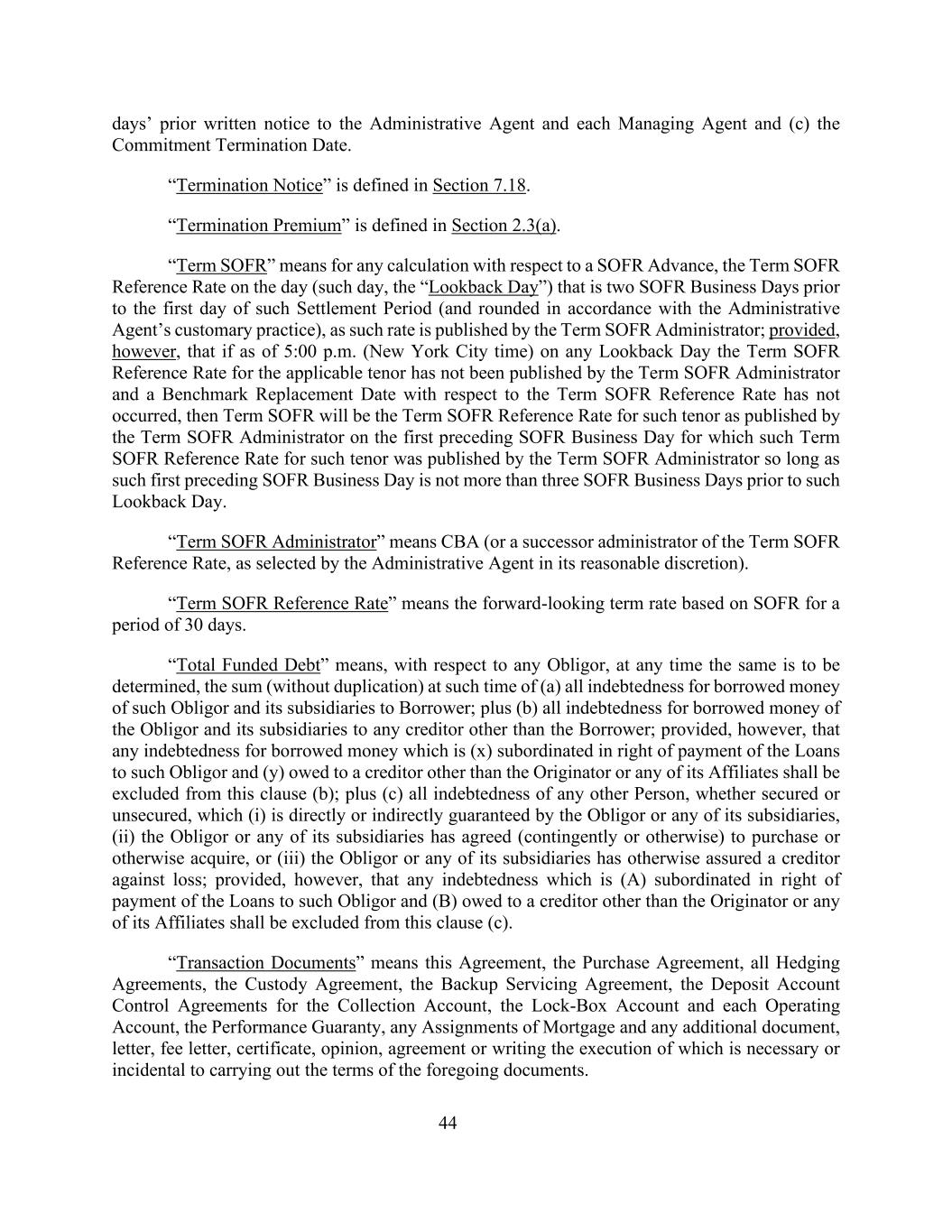 提前44天向行政代理人和各管理代理人发出书面通知和(c)承诺终止日期。“终止通知”在第7.18节中定义。“终止保费”在第2.3(a)节中定义。“Term SOFR”是指就SOFR预付款进行的任何计算,在该结算期第一天之前的两个SOFR营业日当天(该日,“回溯日”)的Term SOFR参考利率(并按照行政代理人的惯例四舍五入),因为该利率由Term SOFR管理员公布;但是,前提是,如截至任何回溯日下午5时(纽约市时间),适用期限的期限SOFR参考利率尚未由期限SOFR管理人公布,且期限SOFR参考利率的基准更换日期尚未发生,则任期SOFR将是任期SOFR管理人在前一个SOFR营业日公布的任期SOFR参考利率,而该任期SOFR营业日之前的第一个任期SOFR参考利率由任期SOFR管理人公布,只要该前一个SOFR营业日不超过该回溯日之前的三个SOFR营业日。“任期SOFR管理员”是指CBA(或任期SOFR参考利率的继任管理员,由行政代理人在其合理酌情权下选择)。“期限SOFR参考利率”是指基于SOFR的前瞻性期限利率,期限为30天。“融资债务总额”是指,就任何债务人而言,在任何时候都将确定(a)该债务人及其附属公司向借款人所借资金的所有债务;加上(b)该债务人及其附属公司向借款人以外的任何债权人所借资金的所有债务的总和(不重复);但前提是,借入款项的任何债务,如(x)在向该债务人的贷款受付权上处于从属地位,且(y)欠发起人或其任何关联公司以外的债权人,则应排除在本条(b)项之外;加上(c)任何其他人的所有债务,不论是否有担保,(i)由债务人或其任何附属公司直接或间接担保,(ii)债务人或其任何附属公司已同意(或有或以其他方式)购买或以其他方式取得,或(iii)债务人或其任何附属公司已以其他方式向债权人保证免受损失;但条件是,(a)在向该债务人的贷款受付权上从属的任何债务和(b)欠除发起人或其任何附属公司以外的债权人的任何债务,应排除在本条(c)项之外。“交易文件”指本协议、购买协议、所有套期保值协议、托管协议、备用服务协议、收款账户的存款账户控制协议、锁箱账户和各经营账户、履约保函、抵押的任何转让以及执行上述文件条款所必需或附带的任何附加文件、信函、费用信函、凭证、意见、协议或书面签署。