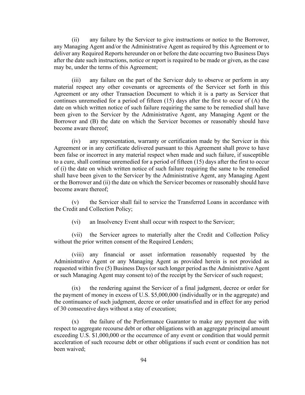 94(ii)任何服务人没有按照本协议的规定向借款人、任何管理代理人和/或行政代理人发出指示或通知,或没有在要求作出或发出该指示、通知或报告(视属何情况而定)的日期后两个营业日发生的日期或之前交付本协议项下所规定的任何报告,根据本协议的条款;(iii)服务人未能适当遵守或在任何重要方面履行本协议或其作为服务人一方的任何其他交易文件中所载的服务人的任何其他契诺或协议,而该等契诺或协议在(a)行政代理人应已向服务人发出要求就该等失败作出补救的书面通知之日起计的第一个发生日期后十五(15)天内继续未获补救,任何管理代理人或借款人,以及(b)服务商成为或合理地应已知悉的日期;(iv)服务商在本协议或根据本协议交付的任何证书中作出的任何陈述、保证或证明,在作出时应证明在任何重要方面是虚假或不正确的,而该等失败,如可能得到补救,应在行政代理人向服务人发出要求对该等失责作出补救的书面通知之日起(i)之日起第一个发生之日起十五(15)日后的十五(15)天内继续无补救,任何管理代理人或借款人,及(ii)服务人成为或合理地应已知悉的日期;(v)服务人不得按照信贷及催收政策为转让的贷款提供服务;(vi)服务人须发生破产事件;(vii)服务人同意实质更改信贷(viii)行政代理人或任何管理代理人在未经所需贷款人事先书面同意的情况下合理要求的任何财务或资产资料,未在服务人收到该要求的五(5)个营业日内(或行政代理人或该管理代理人可能同意的较长期间内)按要求提供;(ix)针对服务人提出的关于支付(单独或合计)超过5,000,000美元的款项的最终判决、法令或命令,以及该判决的延续,未获满足且在连续30天的任何期间内有效且未中止执行的法令或命令;(x)履约担保人未能就本金总额超过1,000,000美元的总追索权债务或其他义务支付任何到期款项,或发生任何允许加速此类追索权债务或其他义务的事件或条件(如果该事件或条件未被放弃);