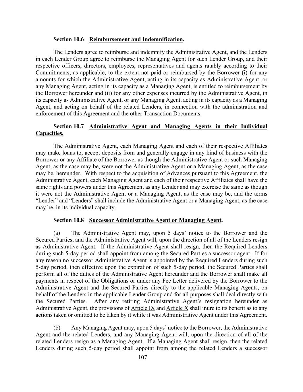 107第10.6节偿还和赔偿。贷款人同意向行政代理人偿还和赔偿,各贷款人集团内的贷款人同意根据其承诺(如适用)按比例向该贷款人集团的管理代理人及其各自的高级职员、董事、雇员、代表和代理人偿还(i)借款人未支付或未偿还的任何金额,以其作为行政代理人的身份行事的行政代理人或任何管理代理人以其作为管理代理人的身份行事的任何金额,有权根据本协议获得借款人的偿还,以及(ii)行政代理人以行政代理人身份或任何管理代理人以管理代理人身份行事并代表相关贷款人在本协议和其他交易文件的管理和执行方面发生的任何其他费用。第10.7节行政代理人和以个人身份管理的代理人。行政代理人、各管理代理人及其各自的关联机构可向借款人或借款人的任何关联机构提供贷款、接受其存款,并一般从事与借款人或借款人的任何关联机构的任何业务,犹如该行政代理人或该管理代理人(视情况而定)并非本协议项下的行政代理人或管理代理人(视情况而定)。就根据本协议取得垫款而言,行政代理人、各管理代理人及其各自的附属公司在本协议下应享有与任何贷款人相同的权利和权力,并可行使与其并非行政代理人或管理代理人(视情况而定)相同的权利和权力,而术语“贷款人”和“贷款人”应包括以个人身份的行政代理人或管理代理人(视情况而定)。第10.8节继任行政代理人或者管理代理人。(a)行政代理人可以在提前5日通知借款人和有担保当事人后,经全体出借人指示,由行政代理人辞去行政代理人职务。行政代理人应当离职的,在该5天期限内的被要求出借人应当从有担保当事人中指定一名继任代理人。如果由于任何原因,在该5天期限内,被要求的贷款人没有指定继任行政代理人,则自该5天期限届满时生效,有担保当事人应履行本协议项下行政代理人的所有职责,借款人应就借款人向行政代理人交付的义务或根据任何费用函向有担保当事人直接向适用的管理代理支付所有款项,并代表适用的贷款人集团中的贷款人,并为所有目的与有担保当事人直接交易。退任行政代理人在本协议项下辞去行政代理人职务后,其在本协议项下担任行政代理人期间采取或不采取的任何行动,按照第九条、第十条的规定,对其有利。(b)任何管理代理人可在向借款人发出5天通知后,行政代理人及有关贷款人,而任何管理代理人将在所有有关贷款人的指示下辞去管理代理人的职务。管理代理人离职的,则该5天期限内的关联出借人应当从关联出借人中指定继任者