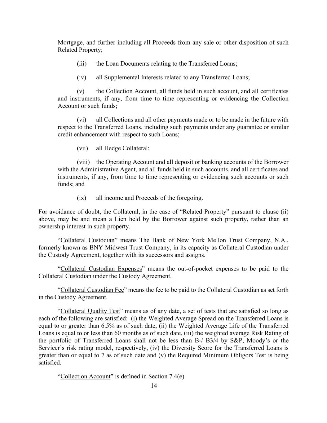 14抵押,并进一步包括出售或以其他方式处置该等相关财产的所有收益;(iii)与转让贷款有关的贷款文件;(iv)与任何转让贷款有关的所有补充权益;(v)收款账户、该账户中持有的所有资金,以及不时代表或证明收款账户或该等资金的所有凭证和票据(如有);(vi)就转让贷款已进行或将在未来进行的所有收款和所有其他付款,包括根据与该等贷款有关的任何担保或类似信用增级而作出的该等付款;(vii)所有对冲抵押品;(viii)经营账户和借款人在行政代理人处的所有存款或银行账户,以及该等账户中持有的所有资金,以及不时代表或证明该等账户或该等资金的所有凭证和票据(如有);及(ix)上述的所有收入和收益。为免生疑问,在根据上文第(ii)款所指的“相关财产”的情况下,担保物可能是且指借款人对此类财产持有的留置权,而不是此类财产的所有权权益。「抵押托管人」指纽约梅隆银行信托公司,N.A.,前身为BNY Midwest Trust Company,以其作为托管协议项下抵押托管人的身份,连同其继任者及受让人。“抵押物托管费用”是指根据托管协议向抵押物托管人支付的自付费用。“抵押物托管费”是指托管协议中规定的应支付给抵押物托管人的费用。“抵押品质量测试”是指截至任何日期,只要满足以下各项,即满足的一组测试:(i)截至该日期,已转让贷款的加权平均利差等于或高于6.5%,(ii)截至该日期,已转让贷款的加权平均年限等于或小于60个月,(iii)经标普、穆迪或服务商风险评级模型对已转让贷款组合的加权平均风险评级分别不低于B-/B3/4,(iv)截至该日期,转让贷款的多样性得分大于或等于7,及(v)正在满足规定的最低义务人测试。“收款账户”在第7.4(e)节中定义。