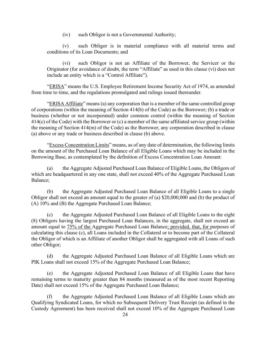 24(iv)该债务人不是政府当局;(v)该债务人实质上遵守其贷款文件的所有重要条款和条件;(vi)该债务人不是借款人、服务人或发起人的关联公司(为免生疑问,本条款(vi)中使用的“关联公司”一词不包括属于“控制关联公司”的实体)。“ERISA”是指美国1974年《雇员退休收入保障法》,经不时修订,以及根据该法案颁布的条例和裁决。“ERISA关联公司”是指(a)作为借款人属于同一受控法团集团(在《守则》第414(b)条的含义内)的任何公司;(b)与借款人在共同控制下(在《守则》第414(c)条的含义内)的贸易或业务(无论是否成立)或(c)作为借款人的同一关联服务集团的成员(在《守则》第414(m)条的含义内)、上文(a)条所述的任何公司或上文(b)条所述的任何贸易或业务。“超额集中限额”是指,在任何确定日期,根据超额集中贷款金额的定义,对可能计入借款基数的所有合格贷款的已购买贷款余额的金额进行以下限制:(a)合格贷款的总调整后已购买贷款余额,其债务人的总部设在任何一个州,不得超过购买贷款余额总额的40%;(b)向单一债务人提供的所有合格贷款的调整后购买贷款余额总额不得超过(a)20,000,000美元和(b)(a)10%和(b)购买贷款余额总额的乘积中的较大者;(c)向购买贷款余额最大的八(8)个债务人提供的所有合格贷款的调整后购买贷款余额总额合计不得超过购买贷款余额总额的75%;但为计算本条款(c),包括在担保物中的所有贷款或成为担保物一部分的所有贷款,而该担保物的义务人是另一义务人的关联方,应与该另一义务人的所有贷款汇总;(d)属于PIK贷款的所有合格贷款的调整后购买贷款余额总额不得超过所购买贷款余额总额的15%;(e)所有合格贷款的调整后购买贷款余额总额剩余到期期限超过84个月(以最近一次报告日计量)的,不得超过所购贷款总额的15%;(f)未收到后续交付信托收据(定义见托管协议)的、属于合格银团贷款的所有合格贷款的调整后所购贷款余额合计不得超过所购贷款总额的10%