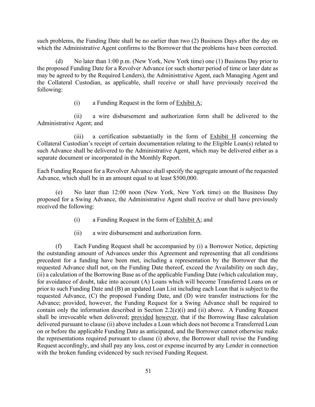 51此类问题,融资日期不早于行政代理人向借款人确认问题已纠正之日后的两(2)个工作日。(d)不迟于下午1:00(纽约、纽约时间)左轮手枪预付款拟议筹资日期(或所需贷款人可能同意的较短期限或较后日期)前一(1)个工作日,行政代理人、各管理代理人和抵押品托管人(视情况而定),应收到或应已收到以下文件:(i)以附件 A形式提出的资金请求;(ii)应向行政代理人交付电汇付款和授权表格;(iii)应向行政代理人交付一份基本上以TERMH形式提供的证明,该证明涉及抵押托管人收到与此类垫款相关的合格贷款(s)有关的某些文件,该证明可作为单独文件交付或并入月度报告。每个循环预付款的资金请求应具体说明请求预付款的总额,其数额应至少等于500,000美元。(e)不迟于提出周转预付款的工作日中午12:00(纽约、纽约时间),行政代理人应收到或应已收到以下文件:(i)以附件 A形式提出的资金请求;(ii)电汇付款和授权表格。(f)每项资金请求均应附有(i)一份借款人通知,说明本协议项下未偿还的预付款数额,并表示已满足任何资金的所有先决条件,包括借款人表示所要求的预付款在其提供资金之日不得超过该日的可用量,(ii)计算截至适用的提供资金之日的借款基数(为免生疑问,该计算可考虑到(a)在该融资日期或之前将成为转让贷款的贷款,以及(b)更新的贷款清单,包括受要求的预付款约束的每笔贷款,(c)拟议的融资日期,以及(d)预付款的电汇指示;但要求周转预付款的资金请求应仅包含上文第2.2(e)(i)和(ii)节中描述的信息。资金请求在交付时不可撤销;但条件是,如果根据上文第(ii)条交付的借款基数计算包括未按预期在适用的资金提供日期或之前成为已转让贷款的贷款,且借款人无法以其他方式作出根据上文第(i)条要求的陈述,则借款人应相应修改资金请求,并应支付任何贷款人因该修改后的资金请求所证明的资金中断而产生的任何损失、成本或费用。
