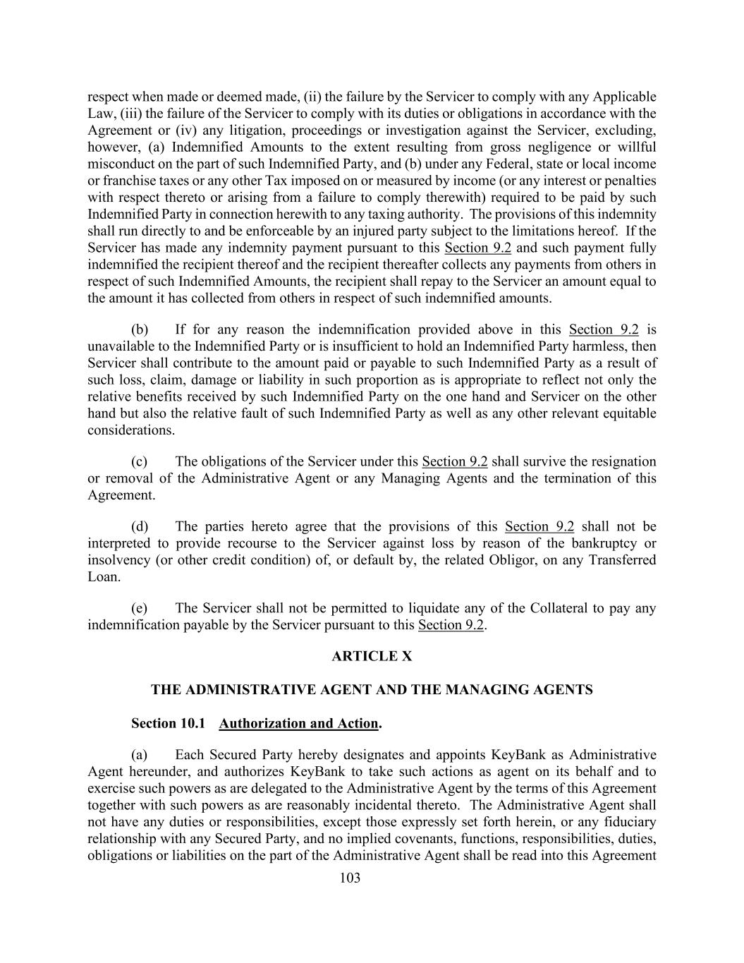 103在作出或当作作出时尊重,(ii)服务人未能遵守任何适用法律,(iii)服务人未能按照协议遵守其职责或义务,或(iv)针对服务人的任何诉讼、程序或调查,但不包括(a)因该受赔偿方的重大过失或故意不当行为而导致的赔偿金额,以及(b)根据任何联邦,州或地方所得税或特许经营税或任何其他按收入征收或计量的税款(或与此相关的任何利息或罚款或因未能遵守这些规定而产生的任何利息或罚款)要求该受赔方就此向任何税务机关支付。本赔偿的规定应在受本赔偿时效限制的情况下直接运行并可由受害方强制执行。如服务人已依据本条第9.2条作出任何弥偿付款,而该等付款已全数向收款人作出弥偿,而收款人其后就该等弥偿金额向他人收取任何款项,则收款人须向服务人偿还与其就该等弥偿金额向他人收取的款额相等的款额。(b)如因任何理由,本条例第9.2条中上述规定的赔偿不能提供予受弥偿方或不足以使受弥偿方免受损害,则服务人须按适当比例分摊因该损失、申索、损害或赔偿责任而支付或应付予该受弥偿方的款额,以不仅反映该受弥偿方一方和服务方分别获得的相对利益,而且反映该受弥偿方的相对过失以及任何其他相关衡平法考虑。(c)服务人根据本条第9.2款承担的义务,在行政代理人或任何管理代理人辞职或被撤职以及本协议终止后仍然有效。(d)本协议各方同意,本条第9.2条的规定不得解释为就任何转让的贷款向服务人提供追索因相关债务人的破产或无力偿债(或其他信用条件)或违约而造成的损失的权利。(e)不得准许服务人清算任何抵押品以支付服务人依据本条第9.2条须支付的任何弥偿。第十条行政代理和管理代理第10.1节授权和行动。(a)每一有担保方特此指定和任命KeyBank为本协议项下的行政代理人,并授权KeyBank以代理人身份代表其采取行动,并行使本协议条款授予行政代理人的权力以及合理附带的权力。行政代理人除本协议明文规定的义务或责任外,不得与任何有担保方有任何受托关系,行政代理人的默示约定、职能、责任、义务、义务或责任不得理解为本协议