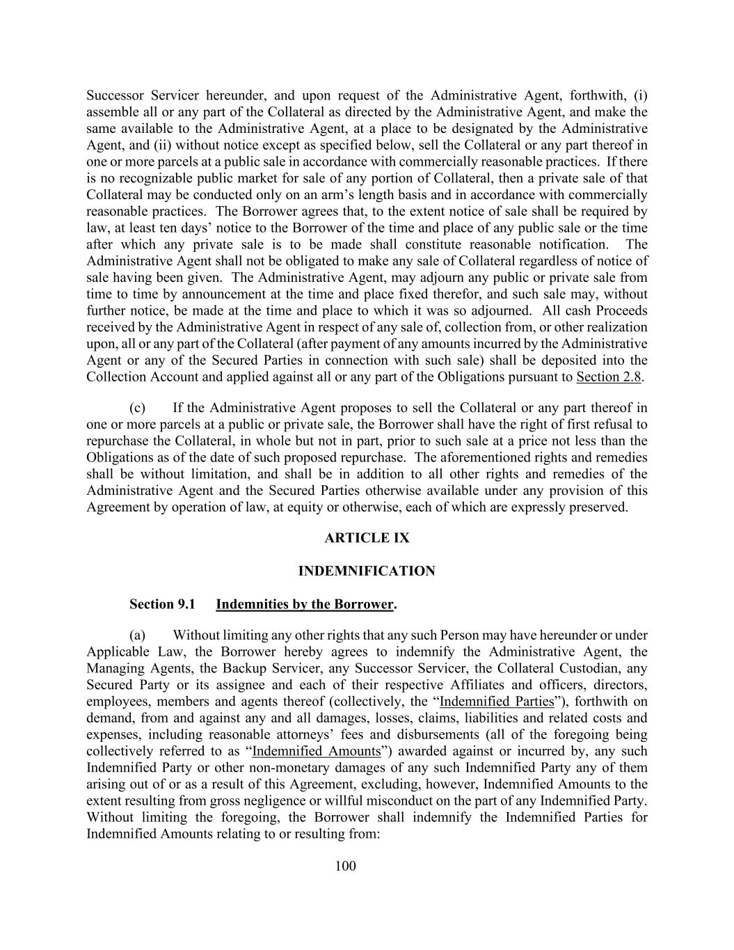 100 Successor Servicer根据本协议,并应行政代理人的要求,随即(i)按照行政代理人的指示组装抵押品的全部或任何部分,并将其提供给行政代理人,在行政代理人指定的地点,以及(ii)除下文指明的情况外,在没有通知的情况下,按照商业上合理的做法以公开出售一个或多个包裹中的抵押品或其任何部分。如果没有可识别的公开市场出售抵押品的任何部分,则该抵押品的私人出售只能在公平的基础上并按照商业上合理的做法进行。借款人同意,在法律要求的出售通知范围内,至少提前十天通知借款人任何公开出售的时间和地点或任何私下出售的时间之后,即构成合理通知。行政代理人无论是否已发出变卖通知,均不承担变卖担保物的义务。行政代理人,可在为其订定的时间和地点不时以公告方式将任何公开或私下出售押后,而该出售可在如此押后的时间和地点进行,而无须另行通知。行政代理人就抵押物的全部或任何部分的任何出售、收款或以其他方式变现而收到的所有现金收益(在行政代理人或任何有担保当事人因该出售而招致的任何金额得到支付后)应存入收款账户,并根据第2.8节的规定用于抵偿全部或任何部分债务。(c)行政代理人提议以公开或私下出售方式分一个或多个宗地出售担保物或其任何部分的,借款人有权在出售前以不低于截至提议回购之日的债务的价格对担保物进行全部而非部分回购。上述权利和补救办法不受限制,并应是行政代理人和有担保当事人在本协议任何条款下通过法律实施、衡平法或其他方式可获得的所有其他权利和补救办法之外的补充,每一项权利和补救办法均明确予以保留。第九条赔偿第9.1节借款人的赔偿。(a)在不限制任何该等人根据本协议或根据适用法律可能拥有的任何其他权利的情况下,借款人特此同意根据要求立即向行政代理人、管理代理、后备服务人、任何继任服务人、抵押品托管人、任何有担保方或其受让人及其各自的关联公司和高级职员、董事、雇员、成员及其代理人(统称“受偿方”)作出赔偿,以抵偿任何和所有损害、损失、索赔、责任以及相关成本和费用,包括因本协议而产生或因本协议而产生或因本协议而产生的任何此类受偿方或任何此类受偿方的其他非金钱损害,但不包括因任何受偿方的重大过失或故意不当行为而导致的合理律师费和支出(上述所有这些统称为“赔偿金额”)。在不限制前述规定的情况下,借款人应就与以下相关或因以下原因导致的赔偿金额向受赔偿当事人进行赔偿: