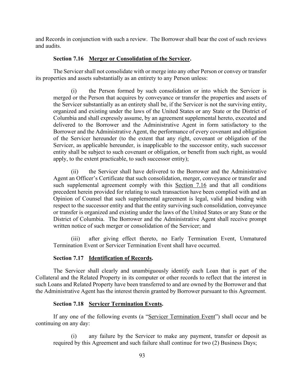 93 and Records in conjunction with such a review。借款人应承担此类审查和审计的费用。第7.16节服务商的合并或合并。服务商不得与任何其他人合并或合并,亦不得将其财产及资产实质上整体转让或转让予任何人,除非:(i)由该等合并所组成的人或服务商并入的人或以转易方式取得或实质上整体转让服务商的财产及资产的人,如该服务商并非存续实体,则须根据美国或任何州或哥伦比亚特区的法律组织和存在,并须明确承担,通过本协议的补充协议,以借款人和行政代理人满意的形式签署并交付给借款人和行政代理人,服务人在本协议项下的每一项契诺和义务的履行(在本协议项下适用的服务人的任何权利、契诺或义务不适用于继承实体的范围内,该继承实体应在切实可行的范围内受该契诺或义务的约束,或受益于将适用的该权利,(二)服务商应已向借款人和行政代理人交付一份官员证书,证明此类合并、合并、转易或转让及此类补充协议符合本条第7.16款的规定,且此处规定的与此种交易有关的所有先决条件均已得到遵守,以及律师关于此类补充协议对继承实体合法、有效和具有约束力以及此类合并尚存的实体的意见,运输或转让是根据美国或任何州或哥伦比亚特区的法律组织和存在的。借款人和行政代理人应当及时收到服务商合并或合并的书面通知;(iii)在其生效后,不得发生提前终止事件、未到期终止事件或服务商终止事件。第7.17节记录的识别。服务人应在其计算机或其他记录中明确无误地识别属于担保物和相关财产的每笔贷款,以反映此类贷款和相关财产的权益已转移给借款人并归其所有,并且行政代理人拥有借款人根据本协议授予的其中权益。第7.18节服务商终止事件。如发生以下任何一项事件(“服务商终止事件”),且在任何一天仍在继续:(i)服务商未能按照本协议的要求进行任何付款、转账或存款,且该失败应持续两(2)个工作日;