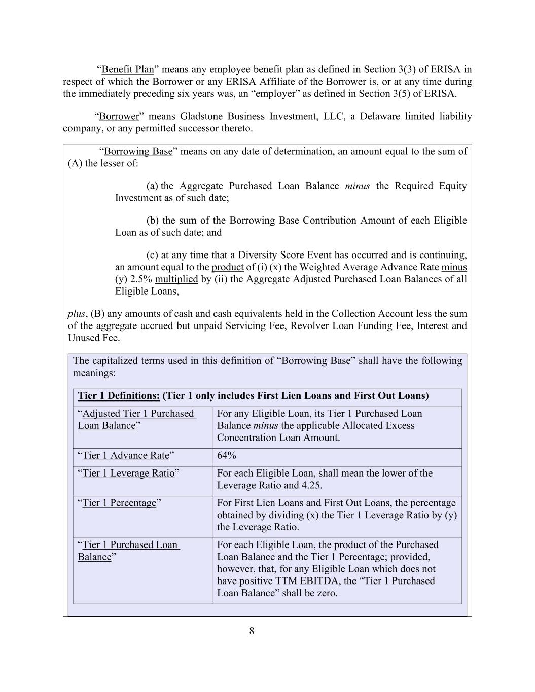 8“福利计划”是指ERISA第3(3)节所定义的任何雇员福利计划,借款人或借款人的任何ERISA关联公司就其而言是,或在紧接前六年的任何时间是ERISA第3(5)节所定义的“雇主”。“借款人”是指Gladstone Business Investment,LLC,一家特拉华州有限责任公司,或任何允许的继任者。“借款基础”是指在任何确定日期,金额等于(a)截至该日期的已购买贷款余额总额减去所需股权投资两者中较低者的总和;(b)截至该日期的每笔合格贷款的借款基础贡献金额之和;(c)在多样性评分事件已经发生并正在继续的任何时间,金额等于(i)(x)加权平均预付率减去(y)2.5%乘以(ii)所有合格贷款的调整后购买贷款余额总额的乘积,加上,(b)收款账户中持有的现金及现金等价物的任何金额减去应计但未支付的服务费、循环贷款资金费用、利息和未使用费用的总和。本定义“借款基”中使用的大写术语应具有以下含义:一级定义:(一级仅包括第一留置权贷款和先出贷款)任何符合条件的贷款的“调整后的一级购买贷款余额”,其一级购买贷款余额减去适用的分配的超额集中贷款金额。每笔符合条件的贷款的“一级预付率”64%“一级杠杆率”,是指杠杆率和4.25中的较低者。“一级百分比”对于第一留置权贷款和先出贷款,通过将(x)一级杠杆率除以(y)杠杆率得到的百分比。每笔符合条件的贷款的“一级已购贷款余额”,是已购贷款余额和一级百分比的乘积;但前提是,对于任何不存在正的TTM EBITDA的符合条件的贷款,“一级已购贷款余额”应为零。