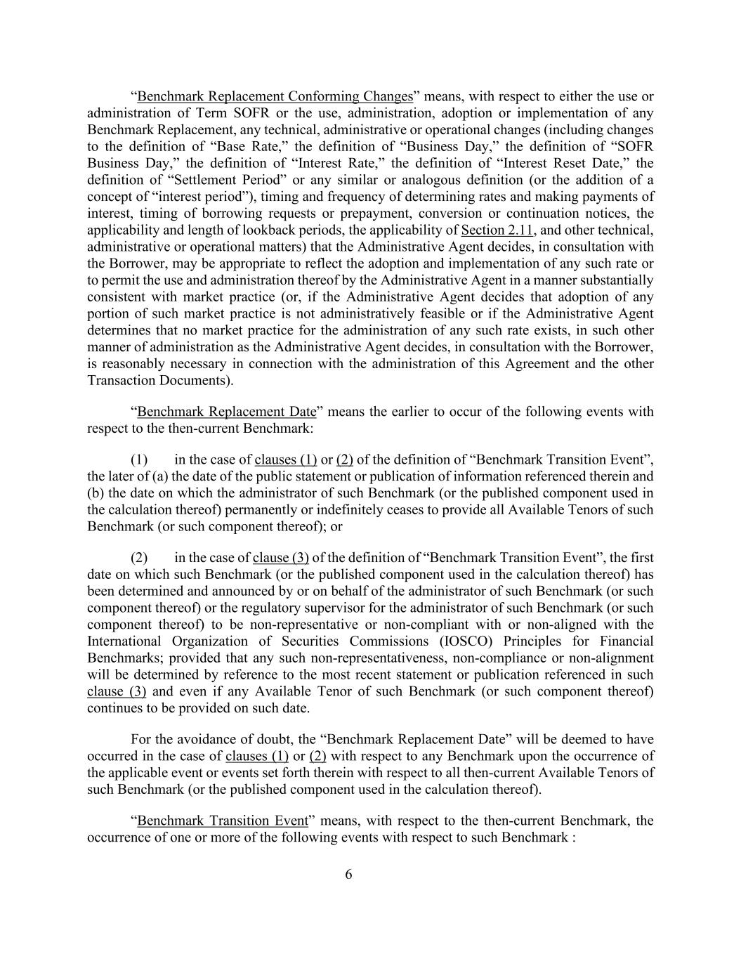 6“基准替换符合性变更”是指,对于Term SOFR的使用或管理或任何基准替换的使用、管理、采用或实施,任何技术、行政或操作变更(包括“基准利率”定义的变更、“营业日”的定义、“SOFR营业日”的定义、“利率”的定义、“利息重置日”的定义,行政代理人与借款人协商决定的“结算期”定义或任何类似或类似定义(或增加“利息期”概念)、确定利率和支付利息的时间和频率、借款请求或提前还款、转换或延续通知的时间、回溯期的适用性和长度、第2.11节的适用性以及其他技术、行政或操作事项),可适当反映任何该等费率的采用和实施情况,或允许行政代理人以与市场惯例基本一致的方式使用和管理该等费率(或,如果行政代理人认为采用该等市场惯例的任何部分在行政上不可行,或如果行政代理人确定不存在管理任何该等费率的市场惯例,则以行政代理人与借款人协商决定的其他管理方式,与本协议和其他交易文件的管理有关是合理必要的)。“基准更换日期”是指与当时的基准相关的以下事件发生较早的日期:(1)在“基准转换事件”定义第(1)或(2)条的情况下,(a)公开声明或公布其中所指信息的日期,以及(b)该基准(或计算该基准时使用的已公布部分)的管理人永久或无限期停止提供该基准(或其此类部分)的所有可用期限的日期,两者中较后者为准;或(2)在“基准过渡事件”定义第(3)条的情况下,此类基准(或其计算中使用的已公布组成部分)由此类基准(或其此类组成部分)的管理人或其代表确定并宣布不具代表性或不符合或不符合国际证监会组织(IOSCO)金融基准原则的监管主管的第一个日期;但任何此类不具代表性,不遵守或不一致将通过参考第(3)条中提及的最新声明或出版物来确定,即使在该日期继续提供此类基准(或其此类组成部分)的任何可用期限。为免生疑问,在第(1)或(2)条有关任何基准的情况下,一旦发生适用的事件或其中所述的有关该基准的所有当时可用期限(或计算该基准时使用的已公布组成部分)的事件,“基准更换日期”将被视为已经发生。“基准过渡事件”是指,就当时的基准而言,就此类基准而言,发生以下一项或多项事件: