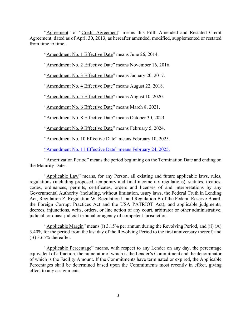 3“协议”或“信贷协议”指本第五份经修订及重述的信贷协议,日期为2013年4月30日,下文不时修订、修改、补充或重述。“第1号修正案生效日期”指2014年6月26日。“第2号修正案生效日期”指2016年11月16日。“第3号修正案生效日期”指2017年1月20日。“第4号修正案生效日期”指2018年8月22日。“第5号修正案生效日期”指2020年8月10日。“第6号修正案生效日期”指2021年3月8日。“第8号修正案生效日期”指2023年10月30日。“第9号修正案生效日期”指2024年2月5日。“第10号修正案生效日期”指2025年2月10日。“第11号修正案生效日期”指2025年2月24日。“摊销期”是指自终止日起至到期日止的期间。“适用法律”是指,对任何人而言,任何政府当局的所有现有和未来适用法律、规则、条例(包括拟议的、临时的和最终的所得税条例)、法规、条约、守则、条例、许可证、证书、命令和许可以及解释(包括但不限于高利贷法、联邦贷款真相法、Z条例、W条例、联邦储备委员会的U条例和B条例、《反海外腐败法》和《美国爱国者法》),以及任何法院、仲裁员或其他有管辖权的行政、司法或准司法法庭或机构的适用判决、法令、禁令、令状、命令或直线行动。“适用保证金”指(i)循环期内的年利率为3.15%,(ii)(a)循环期最后一天至其一周年期间的年利率为3.40%,其后为(b)3.65%。“适用百分比”是指,就任何一天的任何贷款人而言,相当于一个零头的百分比,其分子是贷款人的承诺,其分母是融资金额。如果承诺已经终止或到期,则应根据最近有效的承诺确定适用的百分比,从而使任何转让生效。