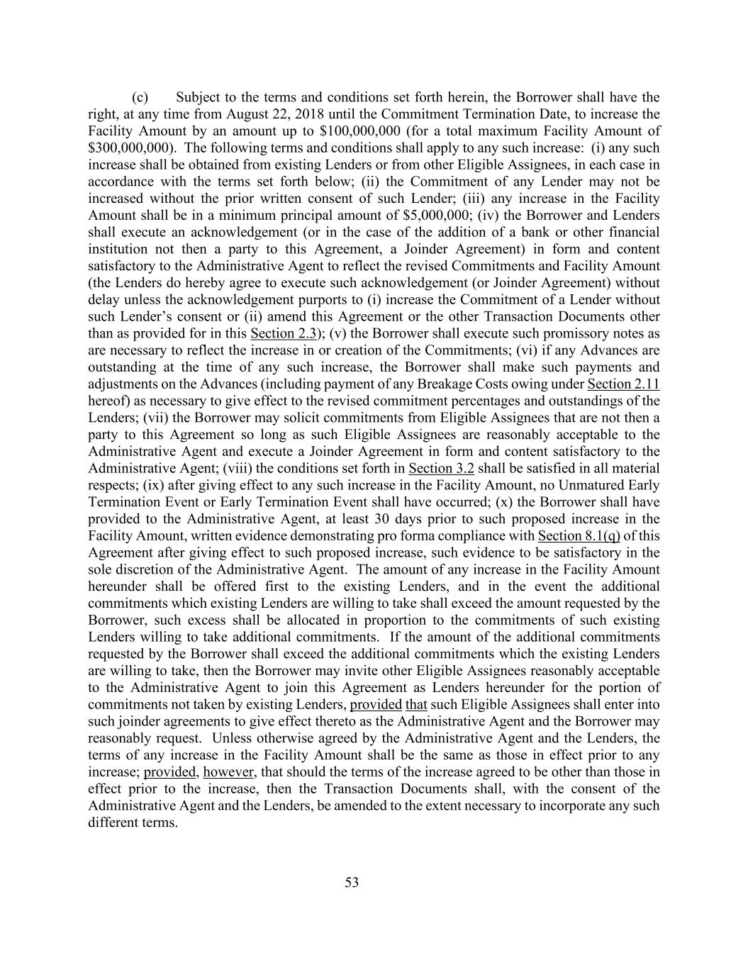 53(c)在符合本协议规定的条款和条件的情况下,借款人有权在2018年8月22日至承诺终止日期的任何时间将融资金额增加至多100,000,000美元(融资总额最高为300,000,000美元)。以下条款及条件适用于任何该等增加:(i)任何该等增加须向现有贷款人或其他合资格受让人取得,在每种情况下均按照下述条款;(ii)未经任何贷款人的事先书面同意,不得增加该贷款人的承诺;(iii)融资金额的任何增加的最低本金金额应为5,000,000美元;(iv)借款人和贷款人应签署确认书(或在增加当时并非本协议缔约方的银行或其他金融机构的情况下,a合并协议)的形式和内容令行政代理人满意,以反映经修订的承付款项和融资金额(贷款人在此同意毫不拖延地执行该确认(或合并协议),除非该确认旨在(i)未经贷款人同意而增加该贷款人的承诺或(ii)修订本协议或除本2.3节规定以外的其他交易文件);(v)借款人应执行必要的本票以反映承诺的增加或创设;(vi)如果在任何此类增加时有任何未偿还的预付款,借款人应就垫款(包括支付根据本协议第2.11条所欠的任何破碎费用)进行必要的付款和调整,以使贷款人的修订承诺百分比和未偿债务生效;(vii)借款人可向合格受让人征求承诺只要行政代理人合理接受该等合资格受让人,并以行政代理人满意的形式和内容签立合并协议,即当时不是本协议的一方;(viii)第3.2节规定的条件应在所有重大方面得到满足;(ix)在任何该等增加融资金额生效后,不得发生未到期的提前终止事件或提前终止事件;(x)借款人应已向行政代理人提供,至少在该提议增加融资金额的30天前,证明在实施该提议的增加后符合本协议第8.1节(q)的形式上的书面证据,该证据由行政代理人全权酌情决定是否令人满意。本协议项下任何增加融资金额的金额应首先提供给现有贷款人,如果现有贷款人愿意承担的额外承诺超过借款人要求的金额,则该超额部分应按愿意承担额外承诺的现有贷款人的承诺比例分配。如果借款人要求的额外承付款项数额超过现有贷款人愿意承担的额外承付款项,则借款人可就现有贷款人未承担的部分承付款项邀请行政代理人合理接受的其他合资格受让人作为本协议项下的贷款人加入本协议,但该等合资格受让人应订立行政代理人和借款人合理要求的合并协议以使其生效。除非行政代理人和贷款人另有约定,任何增加融资额度的条款应与任何增加前有效的条款相同;但如果同意的增加条款不是增加前有效的条款,则交易文件应在行政代理人和贷款人同意的情况下进行必要的修改,以纳入任何此类不同的条款。