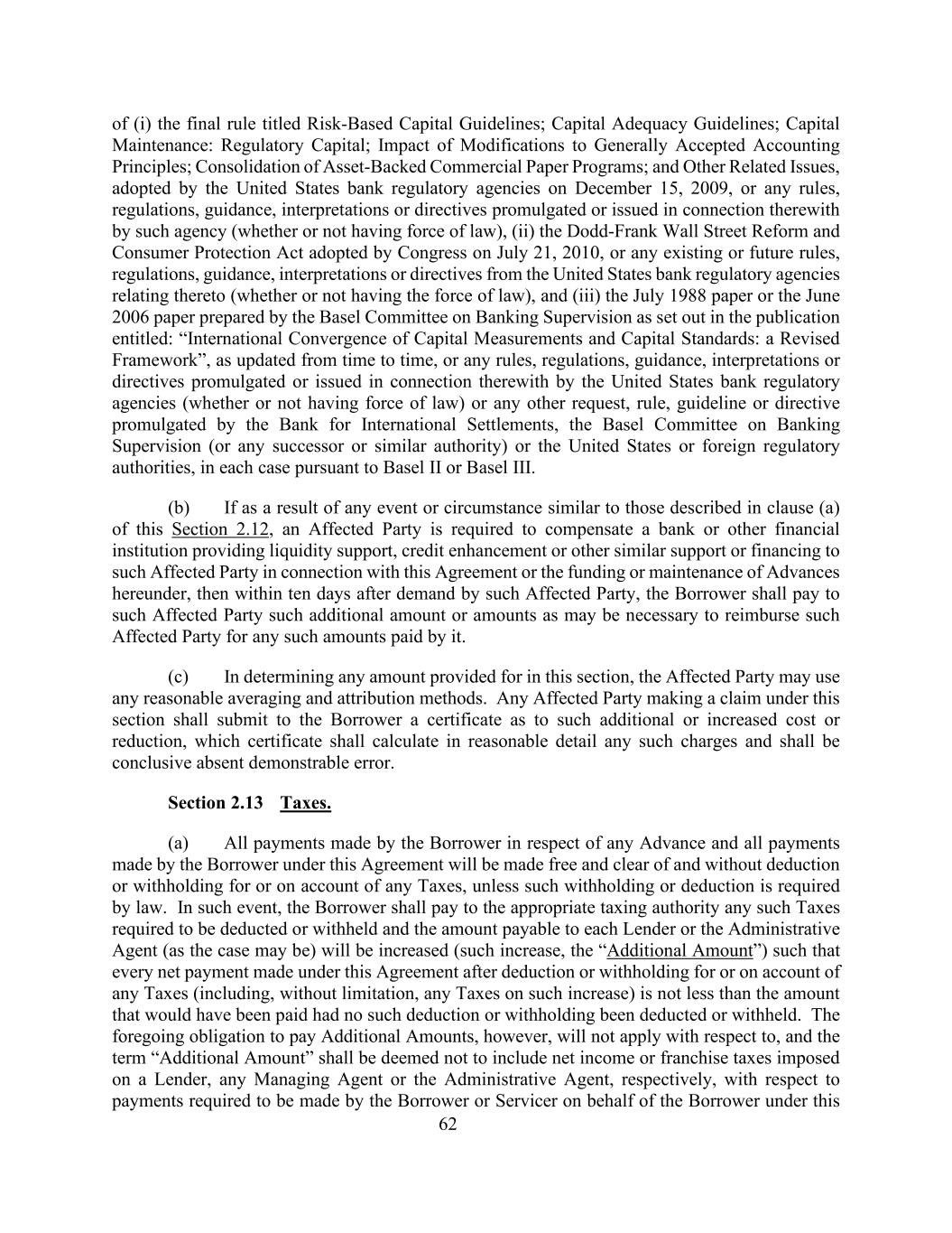 (i)最终规则第62条,标题为基于风险的资本指引;资本充足率指引;资本维持:监管资本;修改公认会计原则的影响;资产支持商业票据计划的合并;以及其他相关问题,由美国银行监管机构于2009年12月15日通过,或由该机构颁布或发布的与此相关的任何规则、条例、指导、解释或指令(无论是否具有法律效力),(ii)国会于2010年7月21日通过的《多德-弗兰克华尔街改革和消费者保护法》,或任何现有或未来的规则、条例、指导,美国银行监管机构与此相关的解释或指示(无论是否具有法律效力),以及(iii)巴塞尔银行监管委员会编写的1988年7月文件或2006年6月文件,载于题为:“资本计量和资本标准的国际趋同:经修订的框架”的出版物中,不时更新,或美国银行监管机构颁布或发布的与此相关的任何规则、条例、指南、解释或指令(无论是否具有法律效力)或任何其他请求、规则,国际清算银行、巴塞尔银行监管委员会(或任何继任或类似机构)或美国或外国监管机构颁布的指导方针或指令,在每种情况下均根据巴塞尔协议II或巴塞尔协议III。(b)如因任何与本条第2.12条(a)款所述的事件或情况类似,受影响一方须就本协议或本协议项下垫款的资金或维持向该受影响一方提供流动性支持、信用增级或其他类似支持或融资的银行或其他金融机构作出赔偿,则在该受影响一方提出要求后十天内,借款人应向该受影响方支付可能需要的额外金额或金额,以偿还该受影响方所支付的任何此类金额。(c)在确定本条规定的任何金额时,受影响方可使用任何合理的平均和归属方法。任何根据本条提出索赔的受影响方应向借款人提交一份关于此类额外或增加的成本或减少的证明,该证明应合理详细地计算任何此类费用,并且在没有明显错误的情况下应是结论性的。第2.13节税收。(a)借款人就任何预付款所作的所有付款以及借款人根据本协议所作的所有付款,将免费、清零,且不会因任何税款或因任何税款而扣除或扣缴,除非法律要求此种扣缴或扣缴。在这种情况下,借款人应向适当的税务机关缴纳任何要求扣除或代扣代缴的此类税款,并增加应支付给每个贷款人或行政代理人(视情况而定)的金额(此类增加,“额外金额”),以使根据本协议为任何税款(包括但不限于此类增加的任何税款)扣除或代扣代缴后的每笔净付款不低于如果没有扣除或代扣代缴本应支付的金额。然而,上述支付额外金额的义务将不适用于,“额外金额”一词应被视为不包括分别对贷款人、任何管理代理人或行政代理人征收的关于借款人或服务人根据本条款要求代表借款人支付的款项的净收入或特许经营税